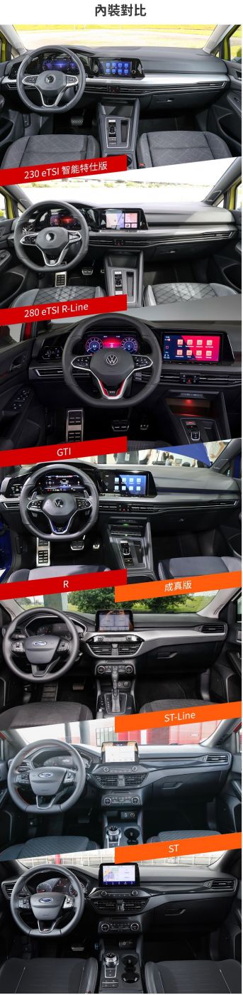 Golf與Focus的入門款圈胎都一樣只有16吋規格,看起來就顯得比較樸素,套上各自的R-Line和ST-Line套件之後,視覺效果更符合本身的動感印象,也難怪路上的Focus大半是ST-Line配置,相信這兩款車的消費者,主要也都是偏好運動風格的年輕族群,至於性能版本,Golf GTI以及Golf R有許多專屬的外觀元素,和其他車型有明顯區隔,反觀Focus ST的空力設計,基礎輪廓和ST-Line接近,相比之下的辨識度就低一些。