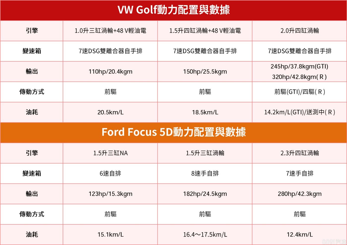 兩車的動力表現互有高低,入門動力較強調經濟性,這方面是Golf勝出,中階動力和性能版本的數據則都是Focus更強。