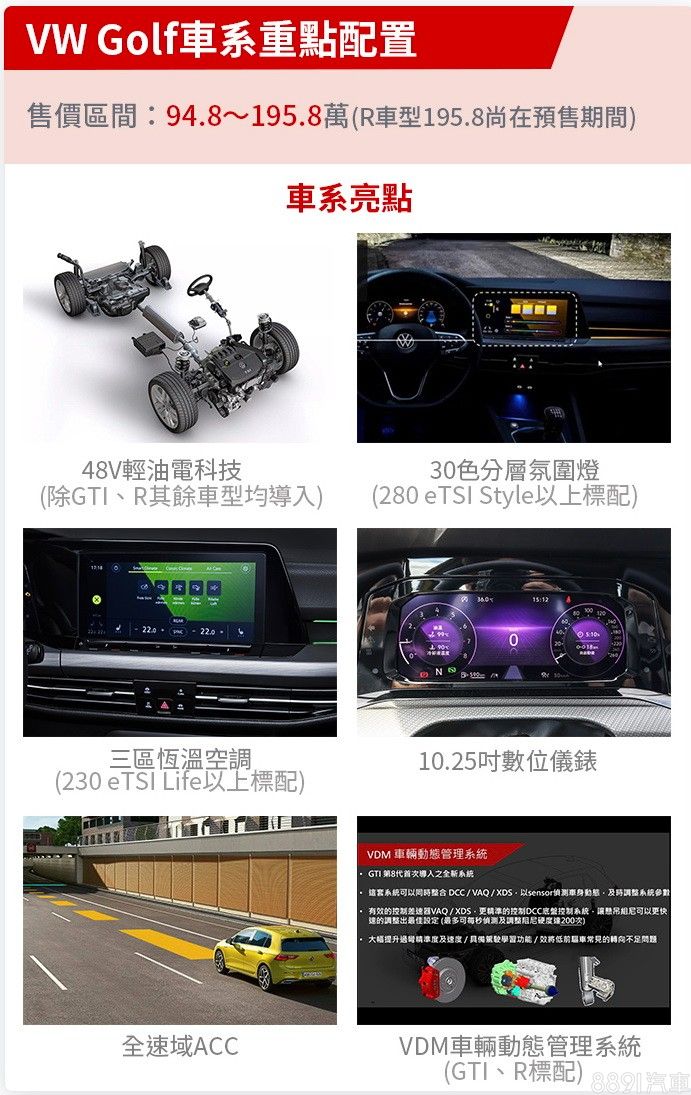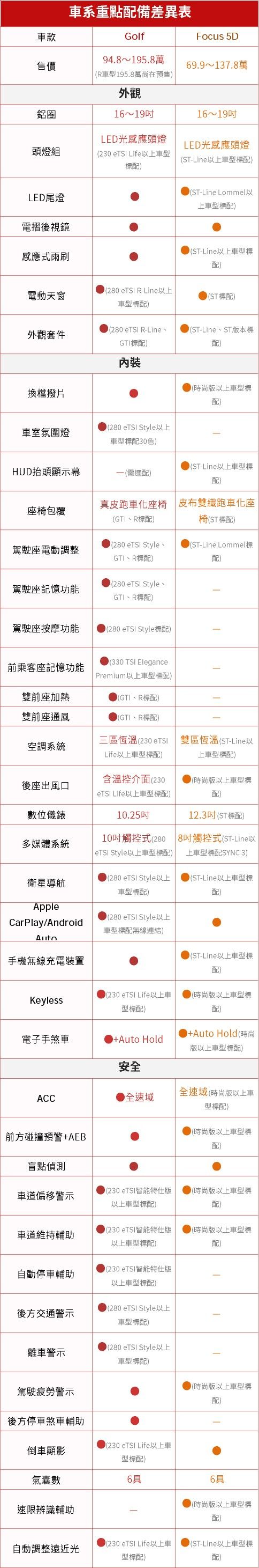 整體比Focus貴一截的Golf,配備也確實下足功夫,性能版以外的動力都加上新世代48V輕油電系統,全車系標配10.25吋數位儀錶、LED頭燈、手機無線充電和全速域ACC,其他重點配備還有三區恆溫空調、10色/30色氛圍燈以及無線Apple CarPlay/Android Auto,以上項目就贏過Focus,另外按照不同車型,還提供座椅按摩(280 eTSI Style)、雙前座通風加熱功能(GTI),是同級之中少見的豪華配置。