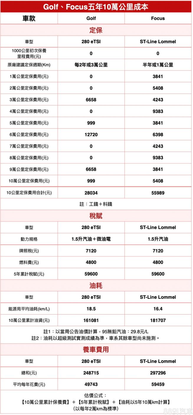 由於Golf適用長里程保養週期,需要回廠的次數比Focus更少,所以10萬公里累積的定保費用只有約Focus一半,而油耗部分也是Golf更好,最後在5年/10萬公里估算的費用,Golf的平均每年花費比Focus便宜近1萬元。