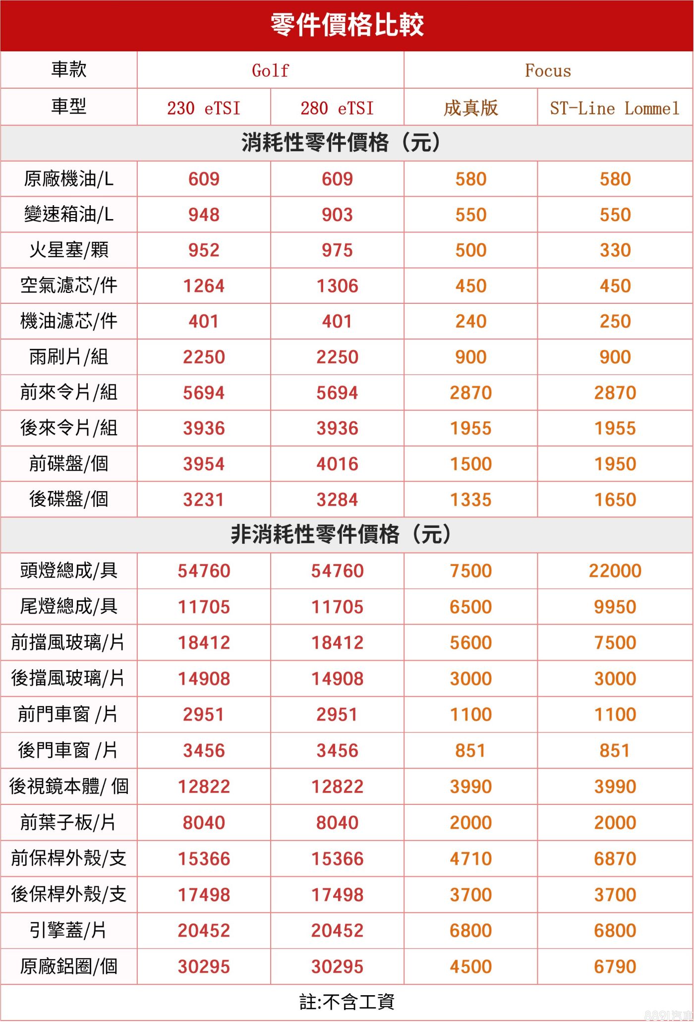 雖然Golf的日常養護省錢省時,但是零件報價就比Focus貴上許多,尤其容易因碰撞需要更換的頭燈、保險桿和引擎蓋等部分,可以說是Focus的數倍起跳,這部分就反映出進口與國產零件的價差。