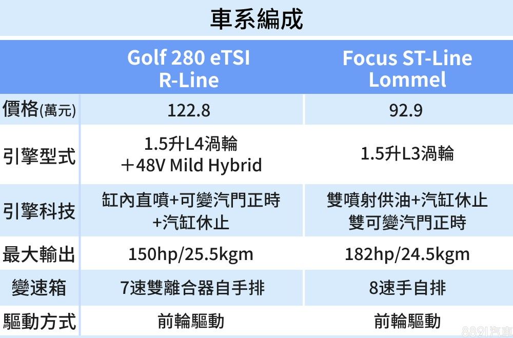 Golf派出122.8萬的280 eTSI R-Line參戰,Focus則為92.9萬的ST-Line Lommel,皆為車系裡的運動化車型擔當,動力部分雖同為1.5升汽油渦輪,不過Focus馬力數據大上一截,Golf雖然帳面數據落於下風,但導入48V微油電系統,勢必能在節能表現上扮演助攻角色。在引擎、變速箱型式、調校都略有差異的前提下,實測表現如何引人好奇。