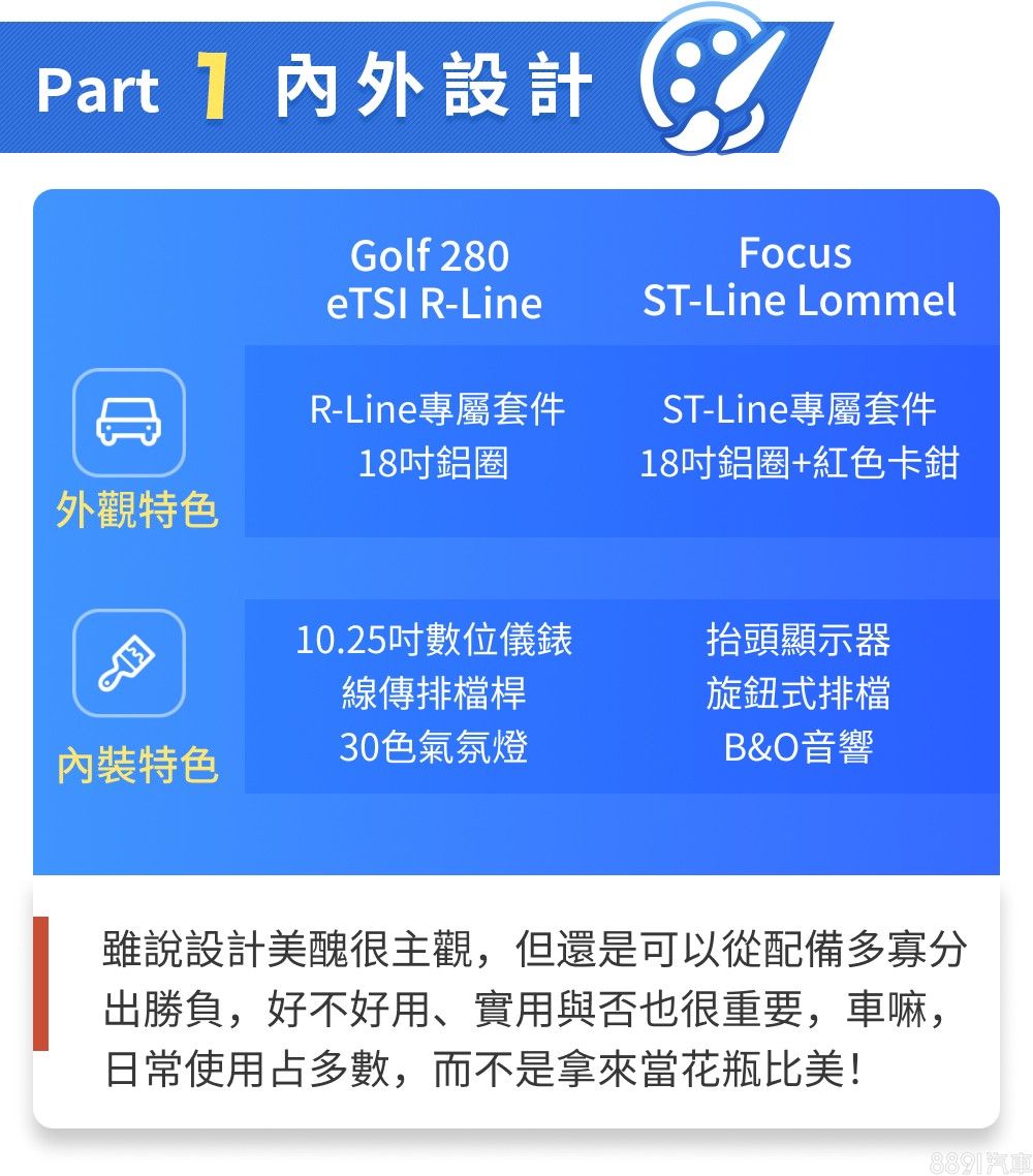 本次兩車都是以運動化為主軸,Focus ST-Line相較於一般版本,前後保桿、水箱護罩設計都不同,看起來更為銳利, Lommel多連桿版本又多出LED尾燈,外觀性能味不遜於貴近30萬的Golf R-Line。Focus論頭燈組絢麗度或許不比Golf,但多出AHB自動遠光燈輔助,夜間視野更加分!