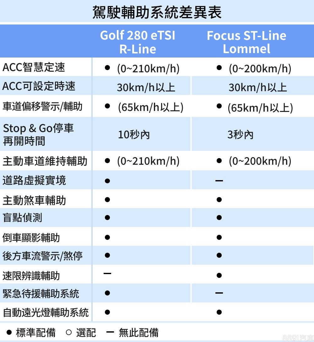 兩輛車都有Level 2半自動駕駛系統,且不論ACC、車道維持做動速域都相仿,不過功能細部仍有差異,像是ACC的Stop & Go停車再開時間便不同,Golf為停車10秒內、Focus為3秒內,另外Golf數位儀錶支援道路虛擬實境顯示,Focus則多出速限辨識輔助,兩者相較下無絕對優勢,皆有其實用之處。