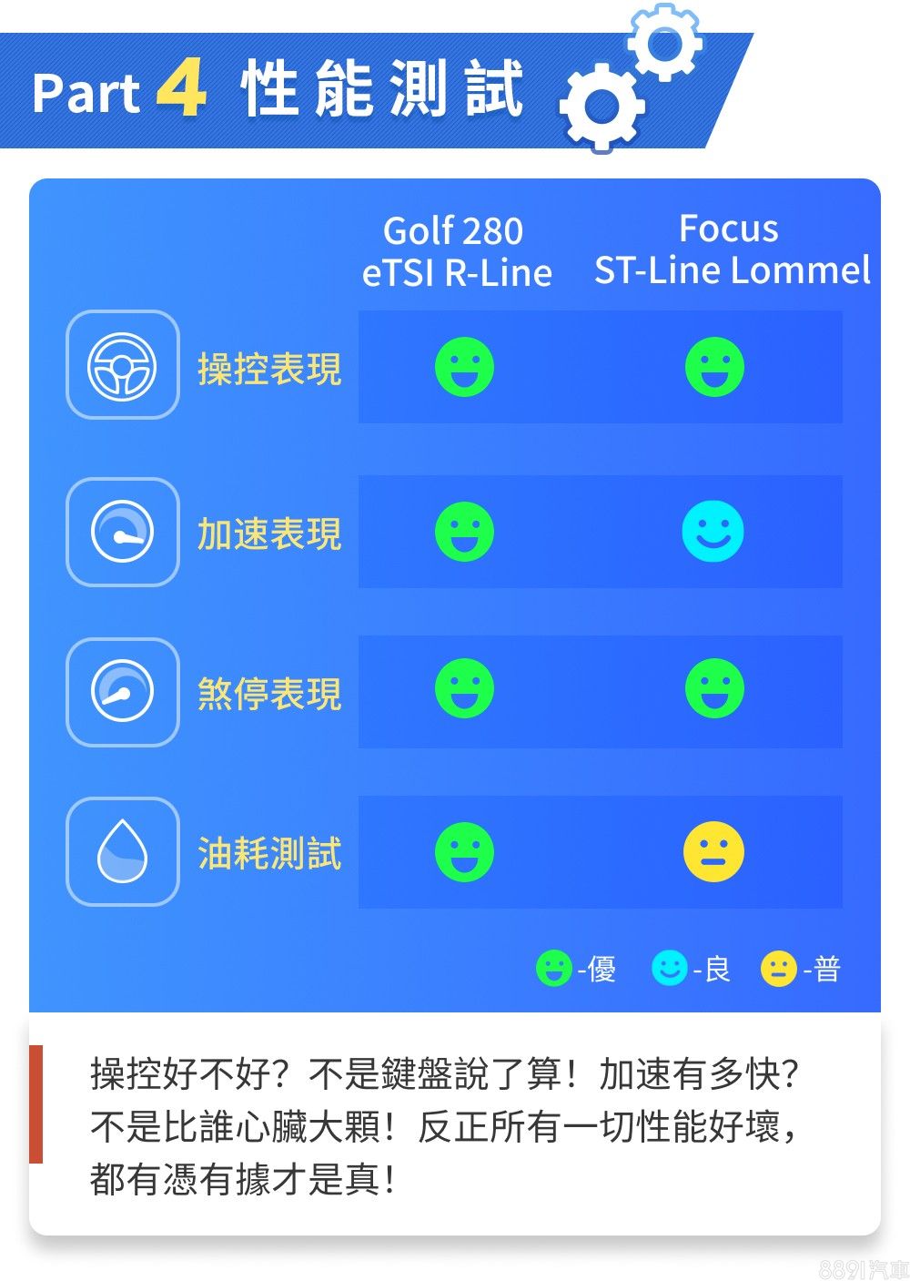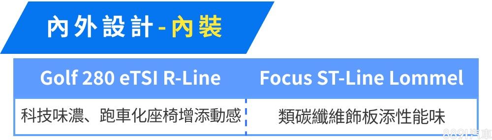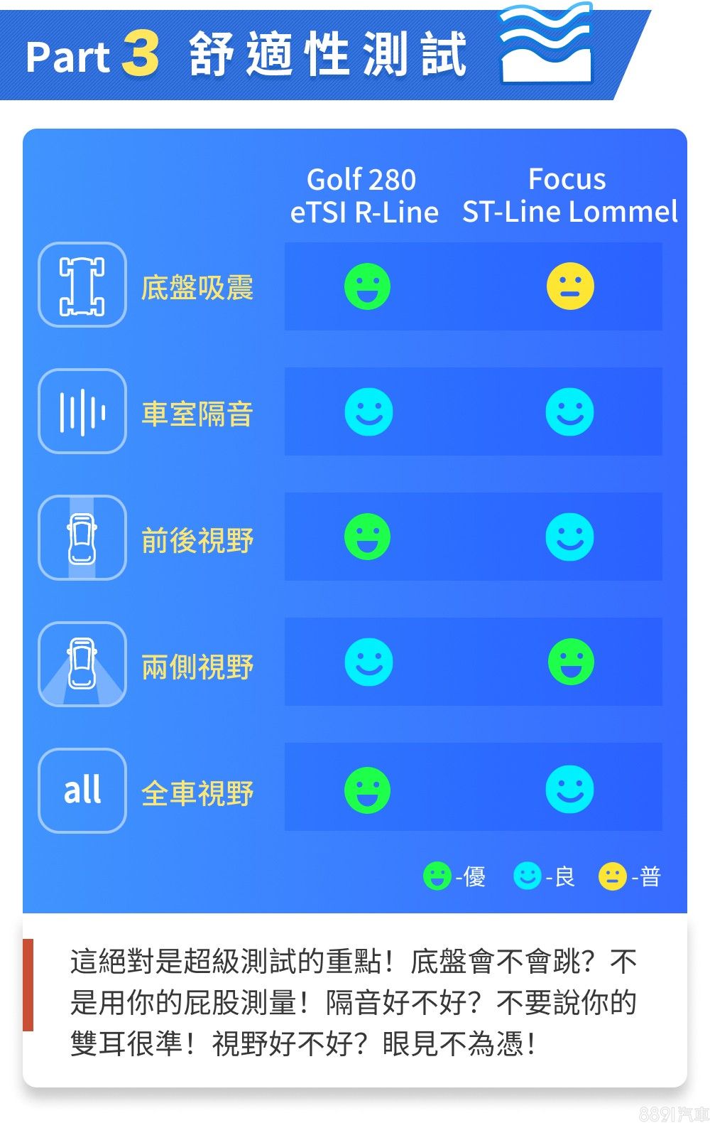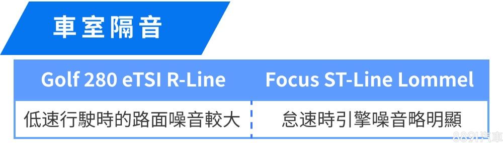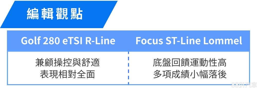 Focus ST-Line Lommel強調運動風格,外觀、內裝和底盤都採用專屬運動化配置,取向和Mazda3、Scala有所區隔,相形之下,Golf 280 eTSI R-Line除了價格之外,各方面條件也都相仿,堪稱是最門當戶對的直接對手,透過超級測試的全方位考驗,看看價差30萬下,是Focus有超值表現?還是Golf價高有理?