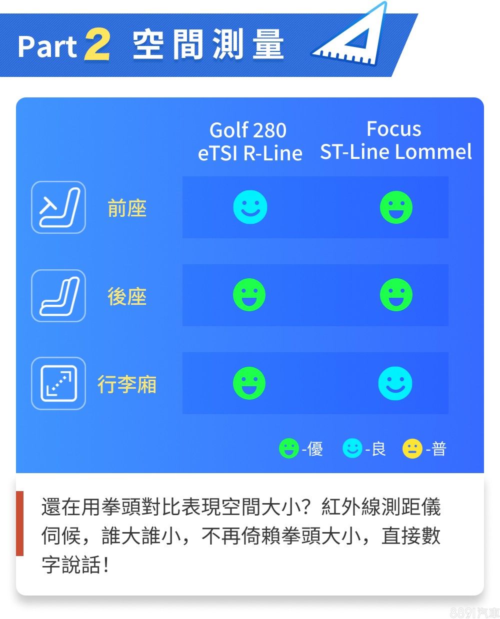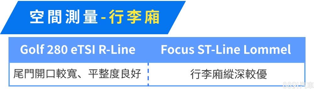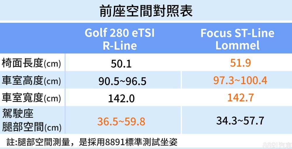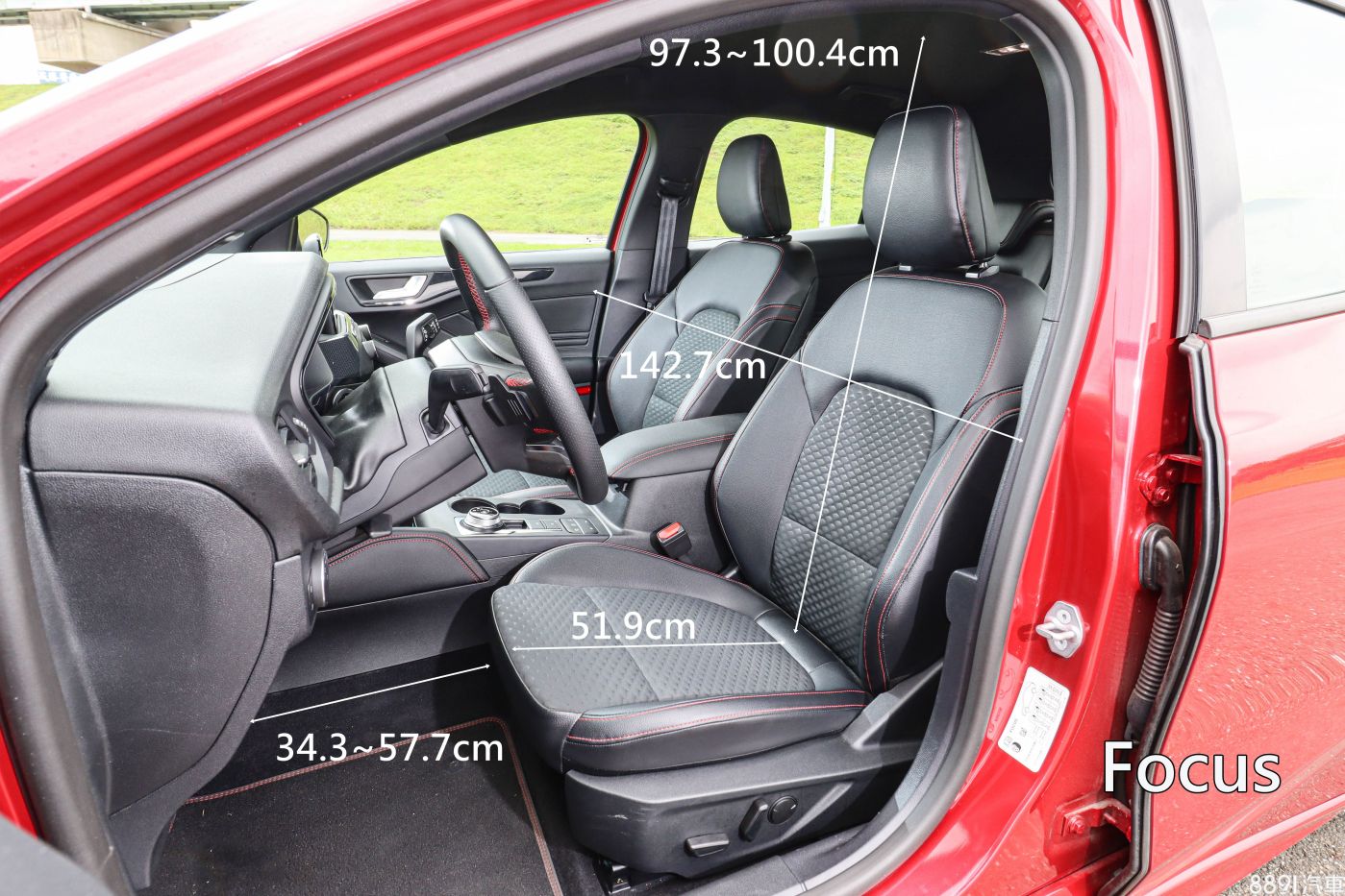 Focus的車身尺碼比起Golf來得略大,反應在實測數據上也是如此,包含車室高度、寬度均較為寬裕、體感也算開闊,Golf則在駕駛座腿部多了更多延展空間,雖說帳面數據上討不到優勢,但實際入座也不會有明顯壓迫感。