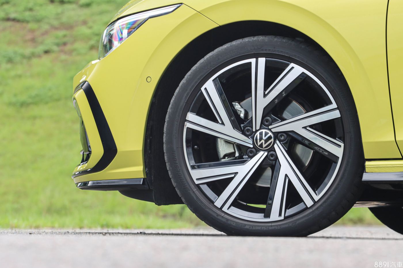 Golf 280 eTSI R-Line腳踩18吋鋁圈,旋風式的設計加上雙色配置,質感與造型都屬出色,搭配225/40R18普利司通Turanza T005,是一款著重舒適取向的轎車胎,配胎等級明顯低於同場較勁的Focus。