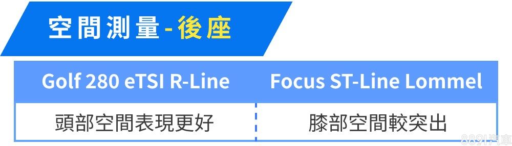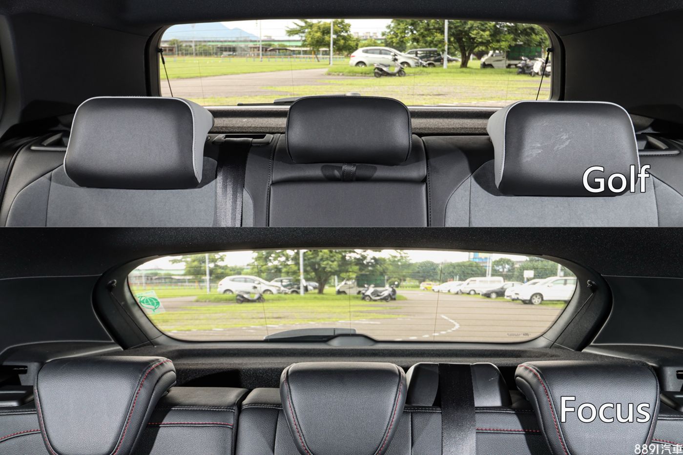 Focus軸距2700mm,比起Golf多了81mm,反應在後排膝部空間也較佳,加上車室稍寬、地板中央隆起低,更有餘裕對應五人滿載時的用車環境,至於Golf則是頭部空間表現較出色,搭配椅背角度更傾斜,實際乘坐時輕鬆無壓力。