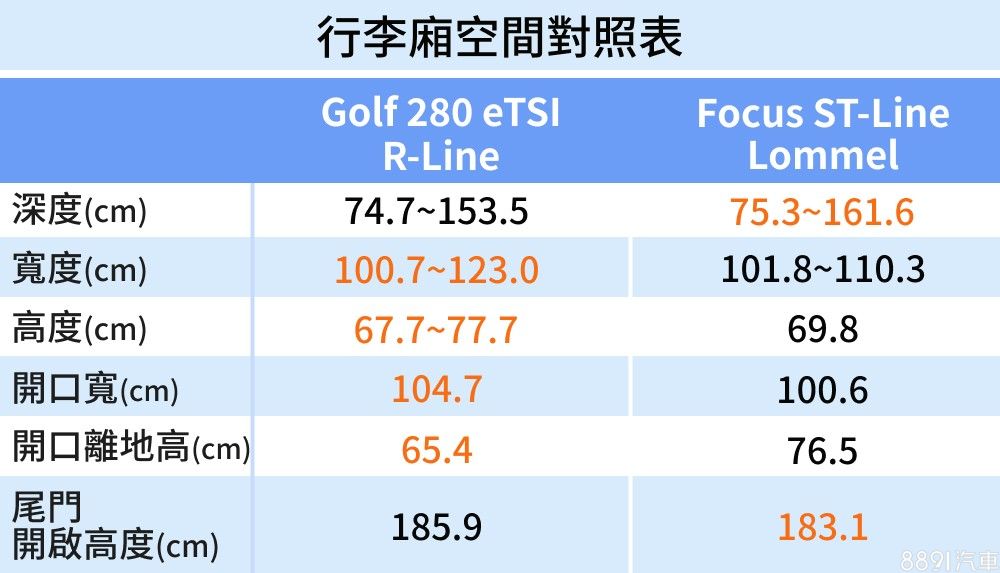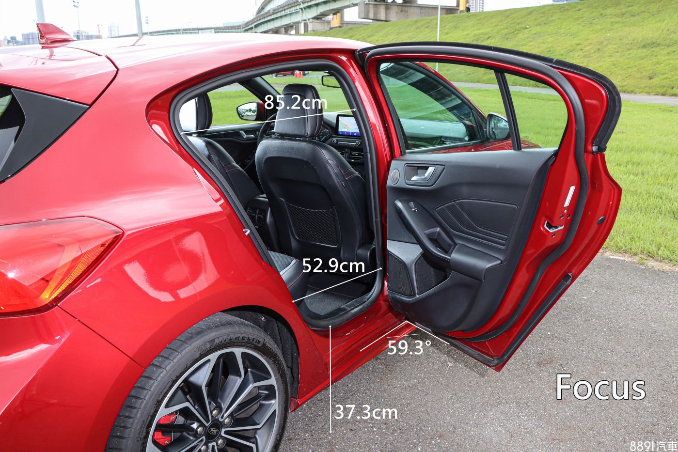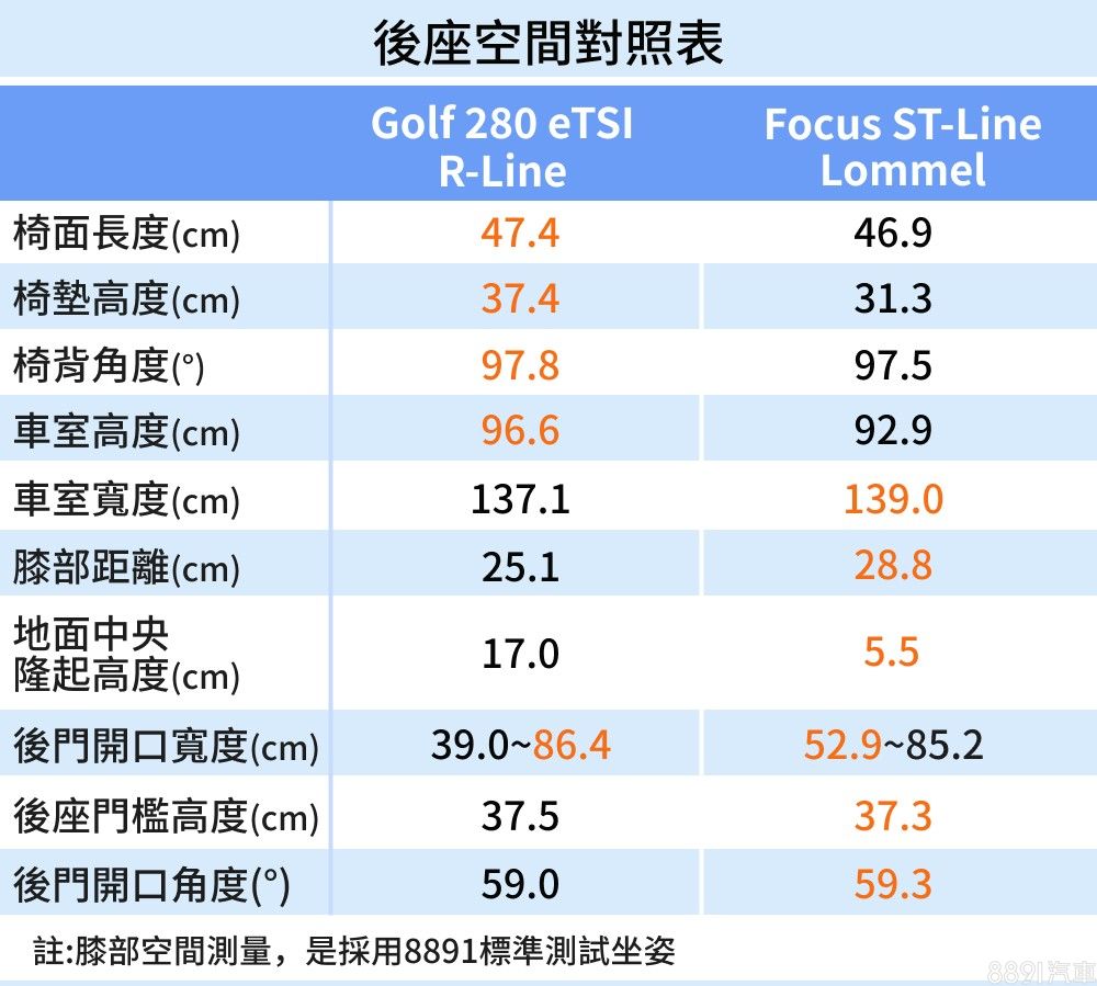 兩車實測開門角度與門檻高度數據相仿,實際跨入車室差異不大,不過Focus車門開口較為方正,最窄處相差近14cm,進出的便利性上小贏Golf一籌。另外關於Golf R-Line有沒有降車高這點,VW Taiwan官網顯示與標準版無異,但德國官網有明確提到車高確實低一點,而從此回門檻高度實測數據也能佐證,相比先前測試的230 eTSI版本確實略降一些。