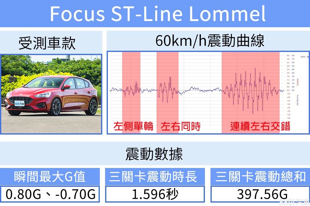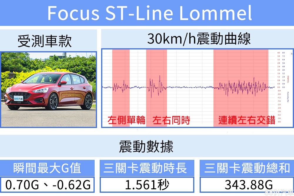 相比之下,Focus在的路感回饋就直接了些,瞬間最大G值達到0.7G,震動時長與總和也略高於對手,但紮實的阻尼設定,在連續壓過陣仗後可使車身迅速回穩,整體來說體感也不會有明顯不適。