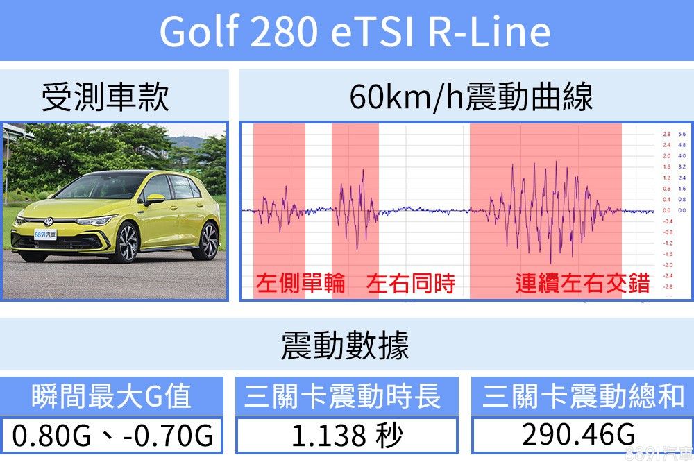 兩車皆強調運動化設定,不過實測可以發現,在30km/h通過陣仗時,Golf各項數據皆低於對手,其懸吊較能有效過濾震動,低速舒適性勝出。