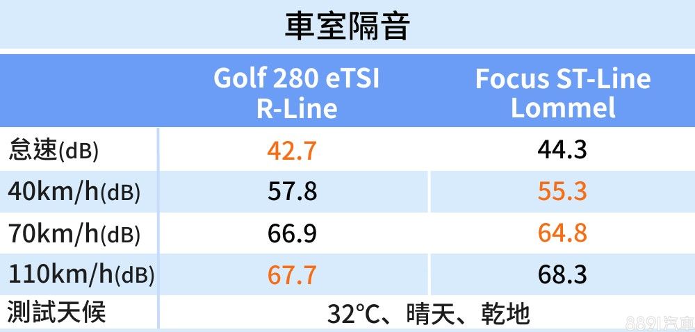 Golf怠速時靜肅性優異,而到了110km/h高速巡航時,風切聲抑制與輪拱隔音的處理也較高明;至於Focus則是在時速40及70km/h的行駛環境中,測得較低的分貝數,市區走停時車艙寧靜度更勝對手。