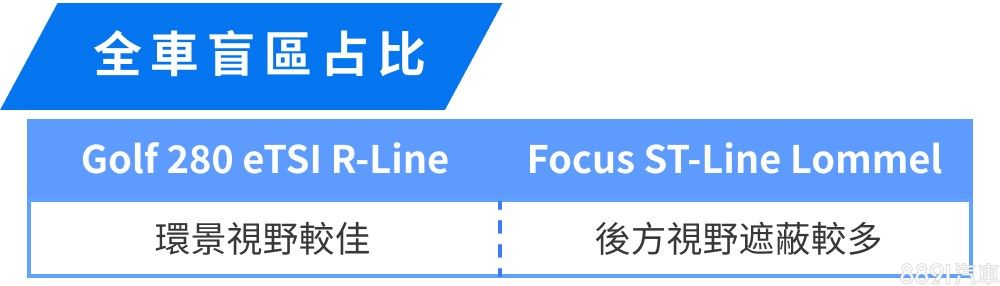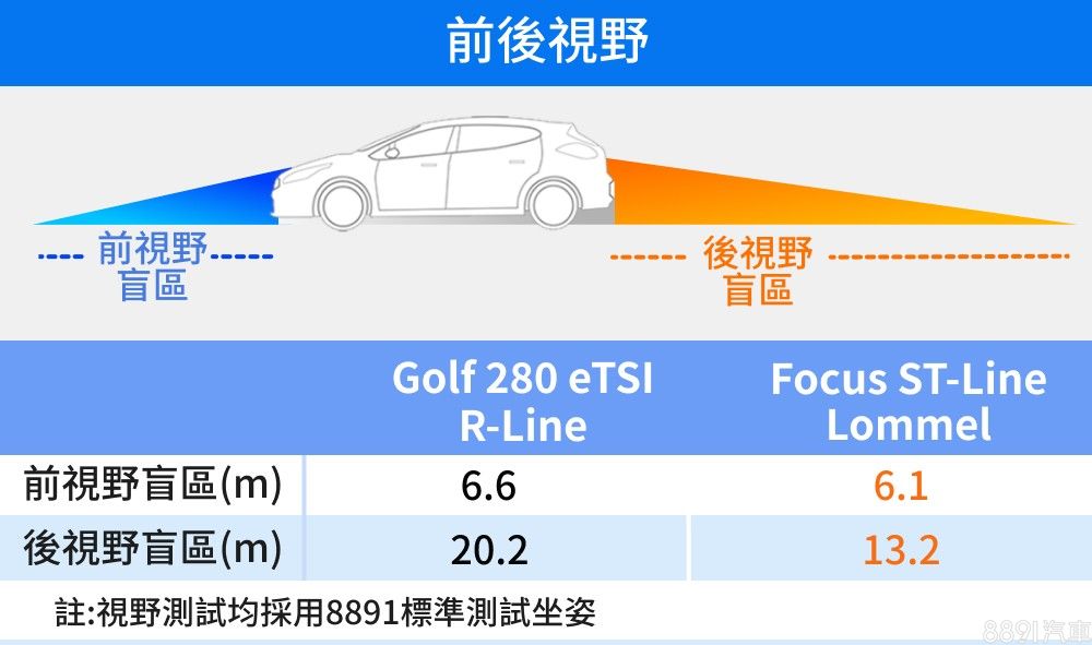 由於 Foucs車頭較低扁、車身腰線低,且乘坐重心偏高,對視野亦有幫助,測得前後視野盲區皆較Golf來的小;Golf則因為著坐點偏低、後擋玻璃面積較小,而讓後視野遮蔽距離長。