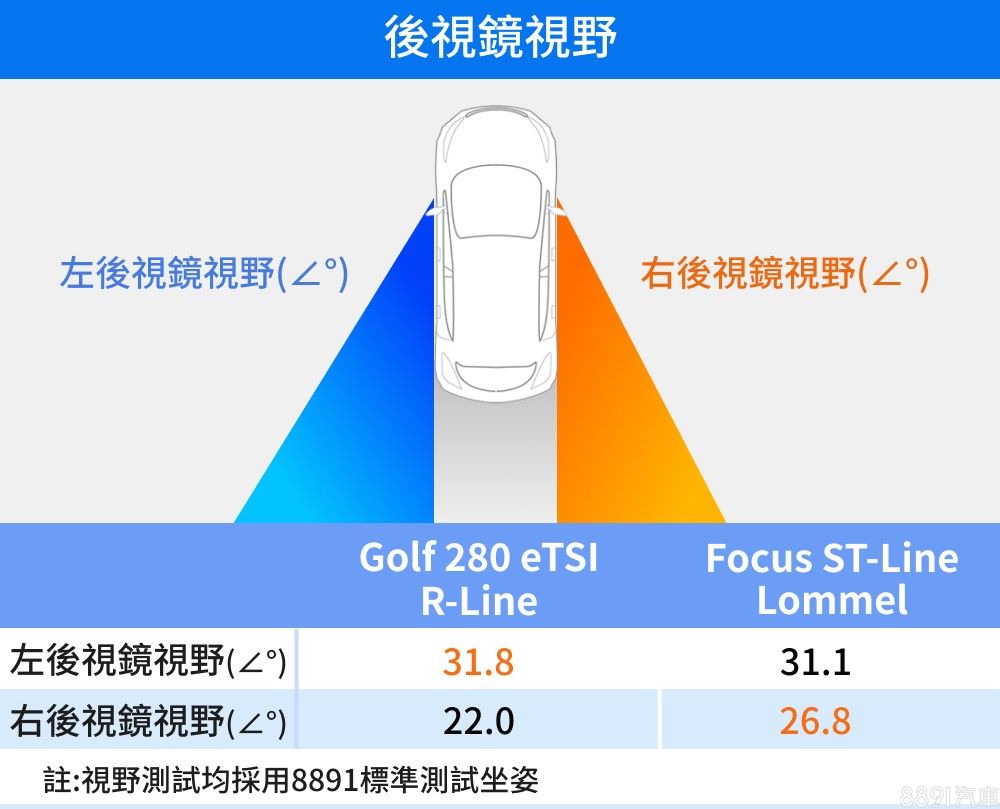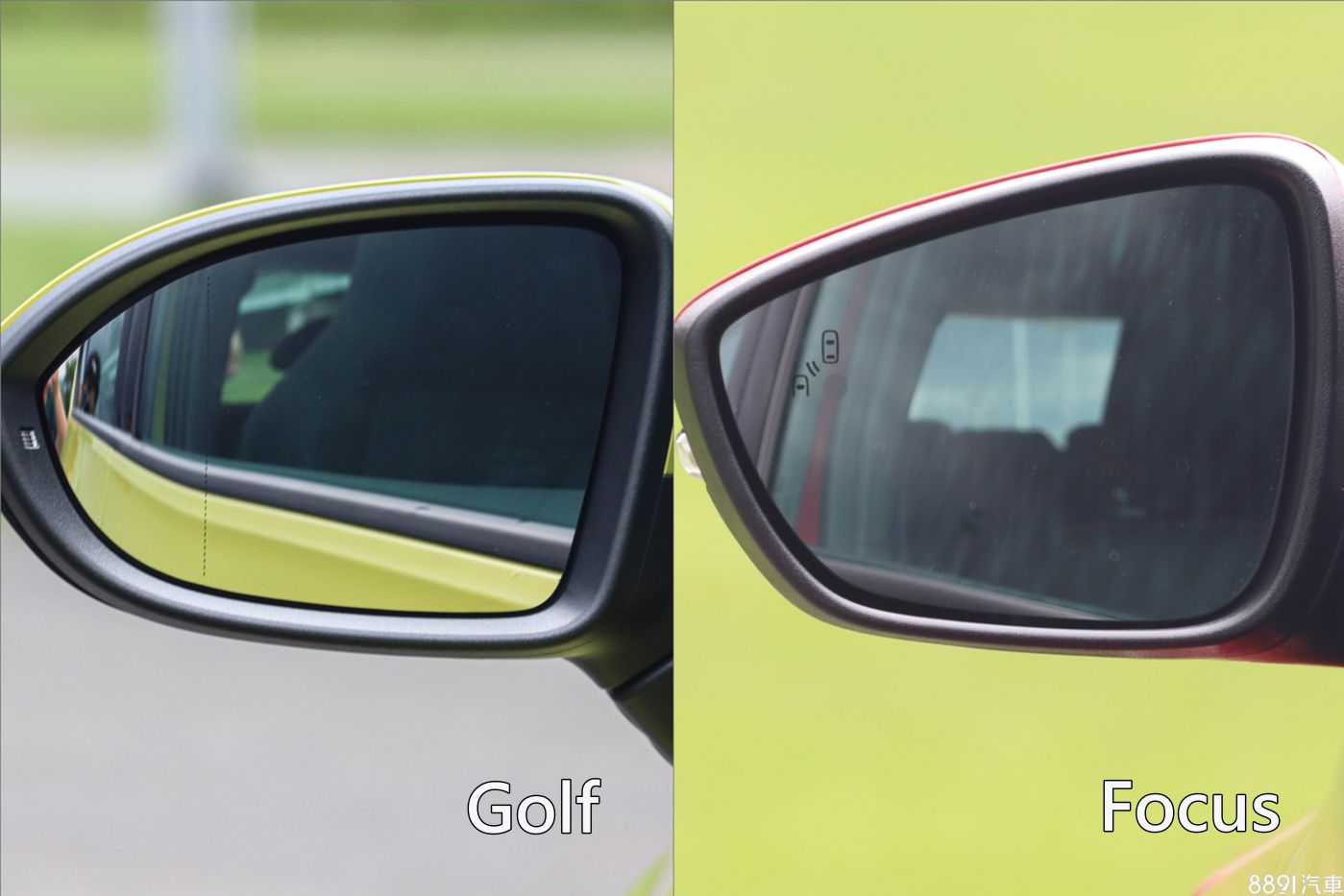 Golf左側後視鏡雖有廣角設計,但實測數據優勢並不明顯,反觀Focus雖不具備廣角,但因為鏡面夠大、造型端正且向外延伸,帶來更開闊的照射範圍。兩車皆有盲點偵測系統,不過Focus是整合在鏡面內,Golf則是設計在後視鏡外殼內側。