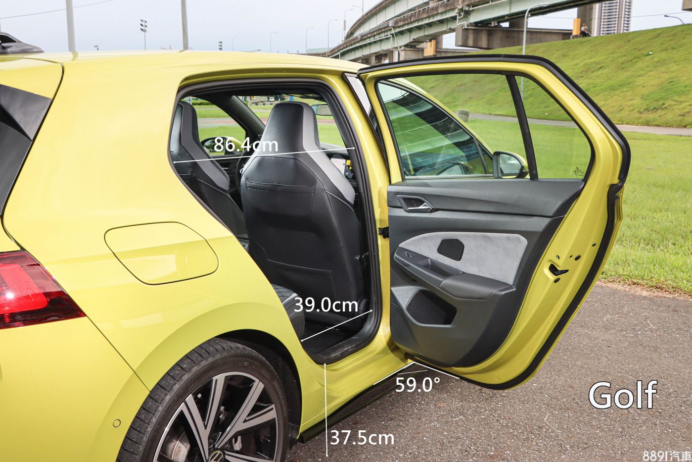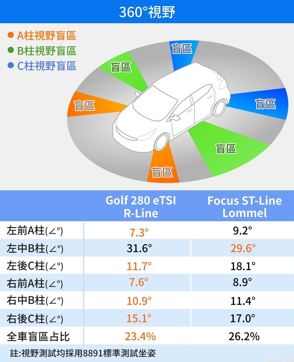 Golf的A柱設計有三角窗,且後視鏡整合於車門上,讓A柱視野較為優異,加上窗戶面積較大、兩側腰線也較平整,使得環車視野相當出色,對比過去測過的同級對手,總遮蔽率23.4%也屬最佳成績。