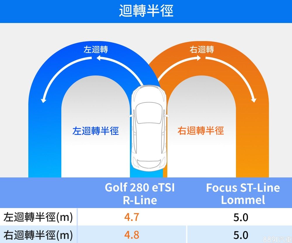 翻閱歷來數據,中型掀背車迴轉半徑坐落於4.5~5.0m範圍,其中Focus因軸距稍長於Golf,實測數據也略大於同級,但仍符合同級水準,實際上路並無明顯差異或不便。
