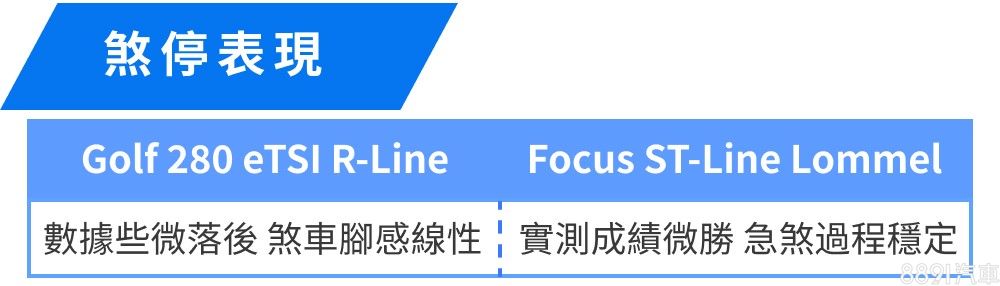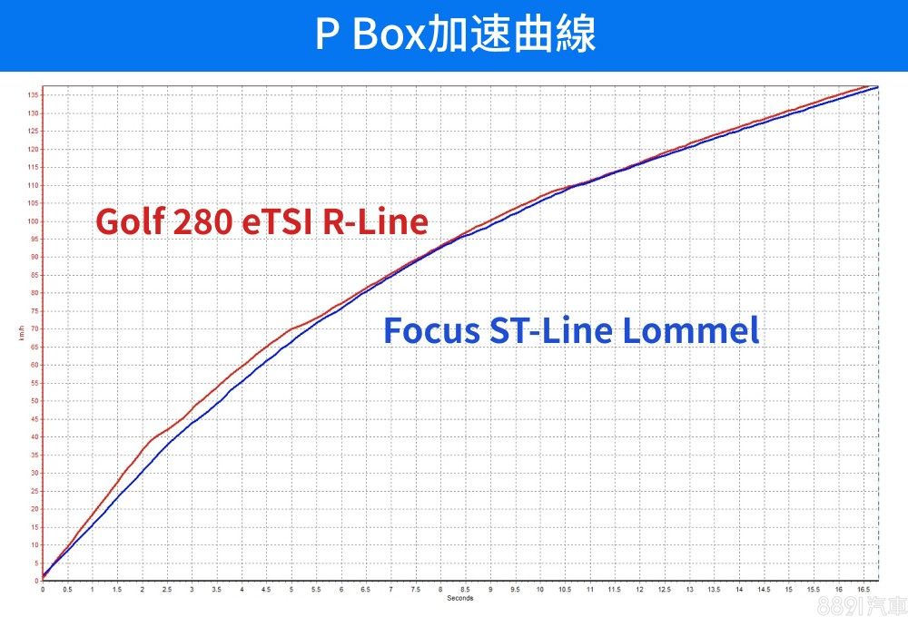 把兩車P Box加速曲線重疊,可以清楚看出Golf 280 eTSI R-Line起步之後就一馬領先,證明Focus ST-Line起步真的有點疲軟,但在85km/h追上Golf 280 eTSI,看來182hp馬力還是展現了威力,可惜最後未能一舉超越對手,頗為可惜。