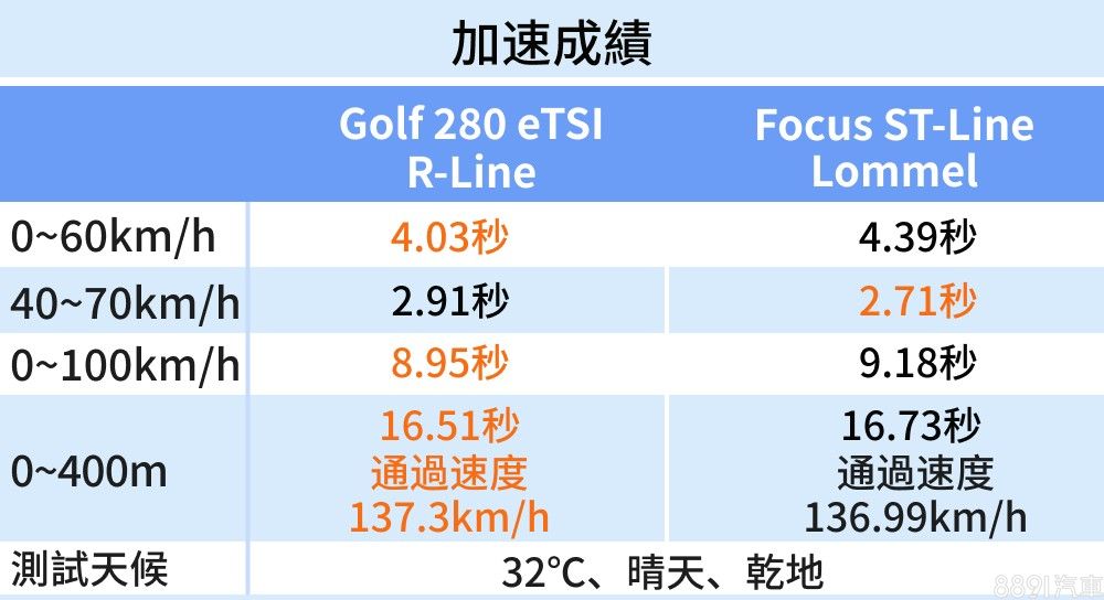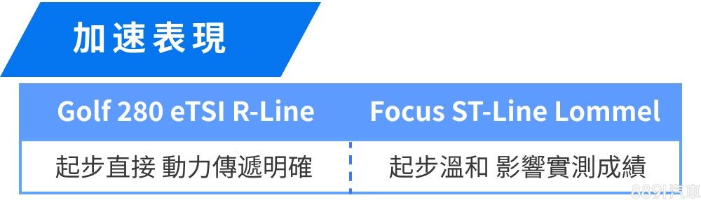 將兩車各項加速成績列出,Focus ST Line幾乎都些微落後,倒是40~70km/h再加速勝出,特別說明一下,此成績並非擷取0~400m測試過程數據,而是獨立另外測試,是以開啟空調、D檔、開啟循跡、一般行車模式,用意是模擬貼近一般用車狀況,恆定車速40km/h之後瞬間油門到底Kicks down,同時考驗引擎出力與變速箱反應,而Focus ST Line在此單項勝出,代表有更好的中段加速,對於日常行車是有幫助的。