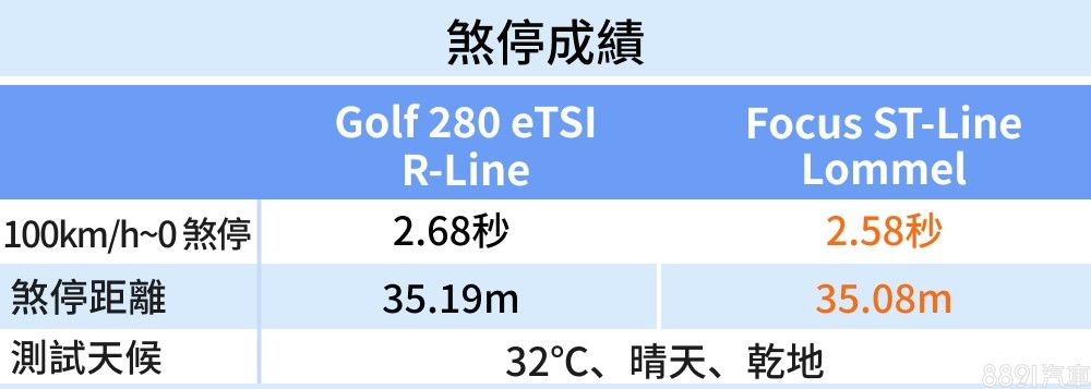 Focus煞停表現出色並不意外,理由是不論煞車規格、輪胎尺碼、配胎等級都比對手優異,如此表現符合預期,實測成績也是勝出;但更令人意外的是Golf表現也在伯仲之間,即便配胎是一般轎車胎,胎寬也略窄,但35.19m的煞車距離依舊理想。