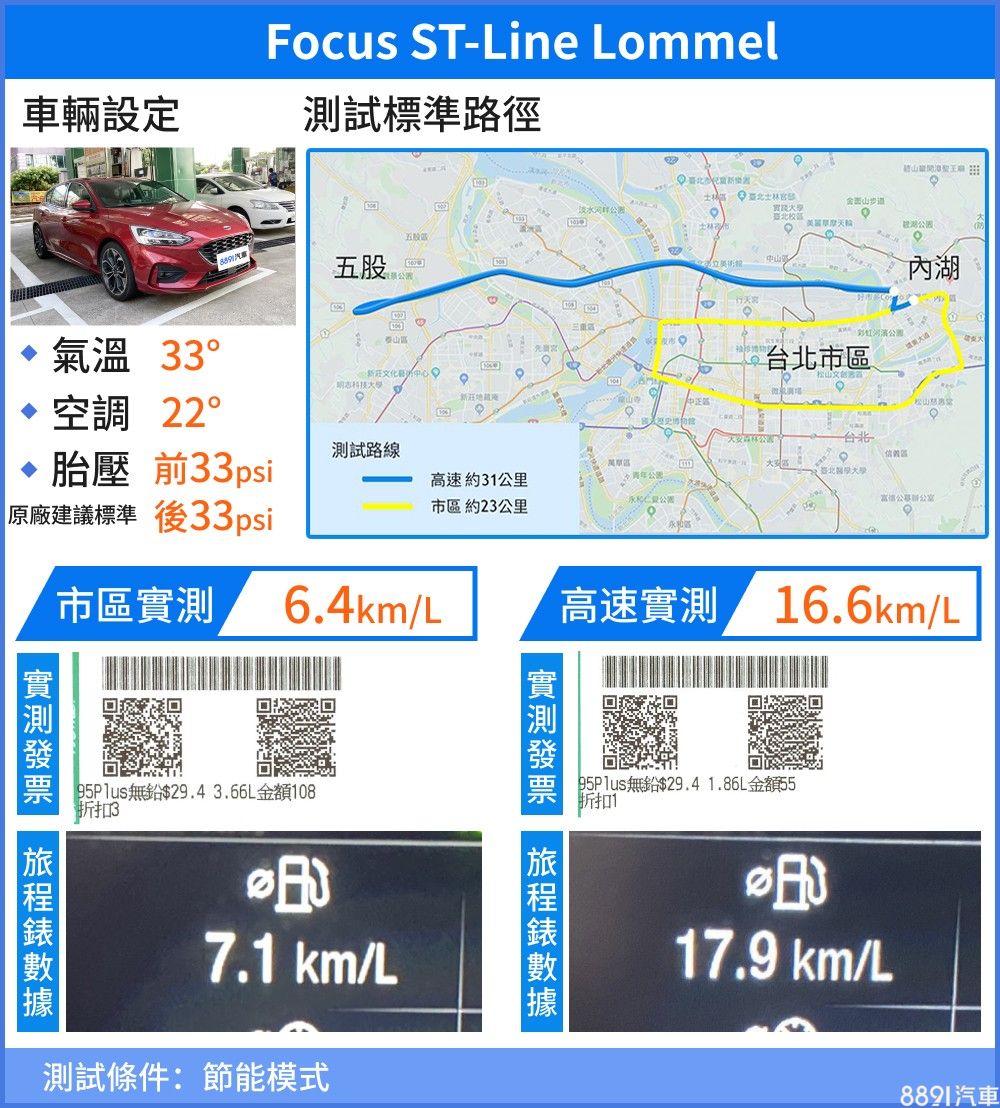 Focus ST-Line在一般道路開起來,扭力輸出比較飽滿,換檔也屬細膩(除了1換2檔),開起來的暢快感比Golf 280eTSI R-Line好上一點。以運動模式進行測試,左腳剎車、右腳油門,起跑轉速較低,衝出瞬間似乎是變速箱保護抑制動力,讓起步略嫌和緩,另外就跟過往我們測試一樣,4檔會提早進入5檔,反覆測過幾趟後,最終獲得0~100km/h加速9.18秒的數據,比起之前實測8.6~8.7秒略慢一些,為此我們也反覆確認車況,最終確認車況正常,成績即是如此。