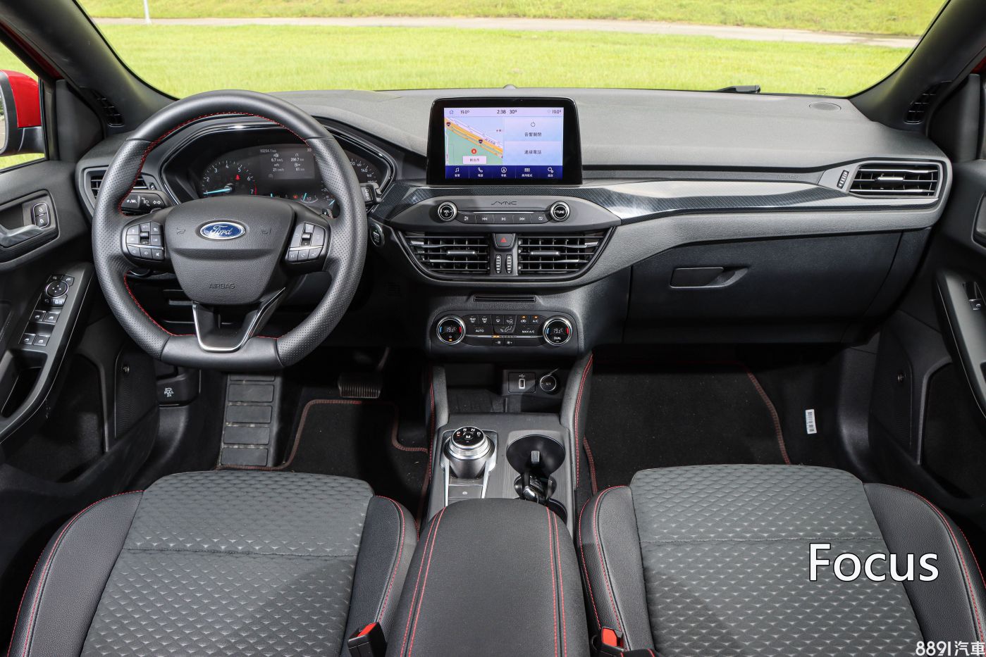 Focus ST-Line內裝採黑頂棚、類碳纖飾板,嗅得出鮮明的運動氛圍,與Golf同場相較之下,少了全數位儀錶、保留更多實體按鍵,也沒有環艙氛圍燈配置,雖然這些配備不影響實用性,Focus試了不少次,也無覺得有任何不足之處,但視覺絢麗度就是差一截,整體看起來中規中矩。