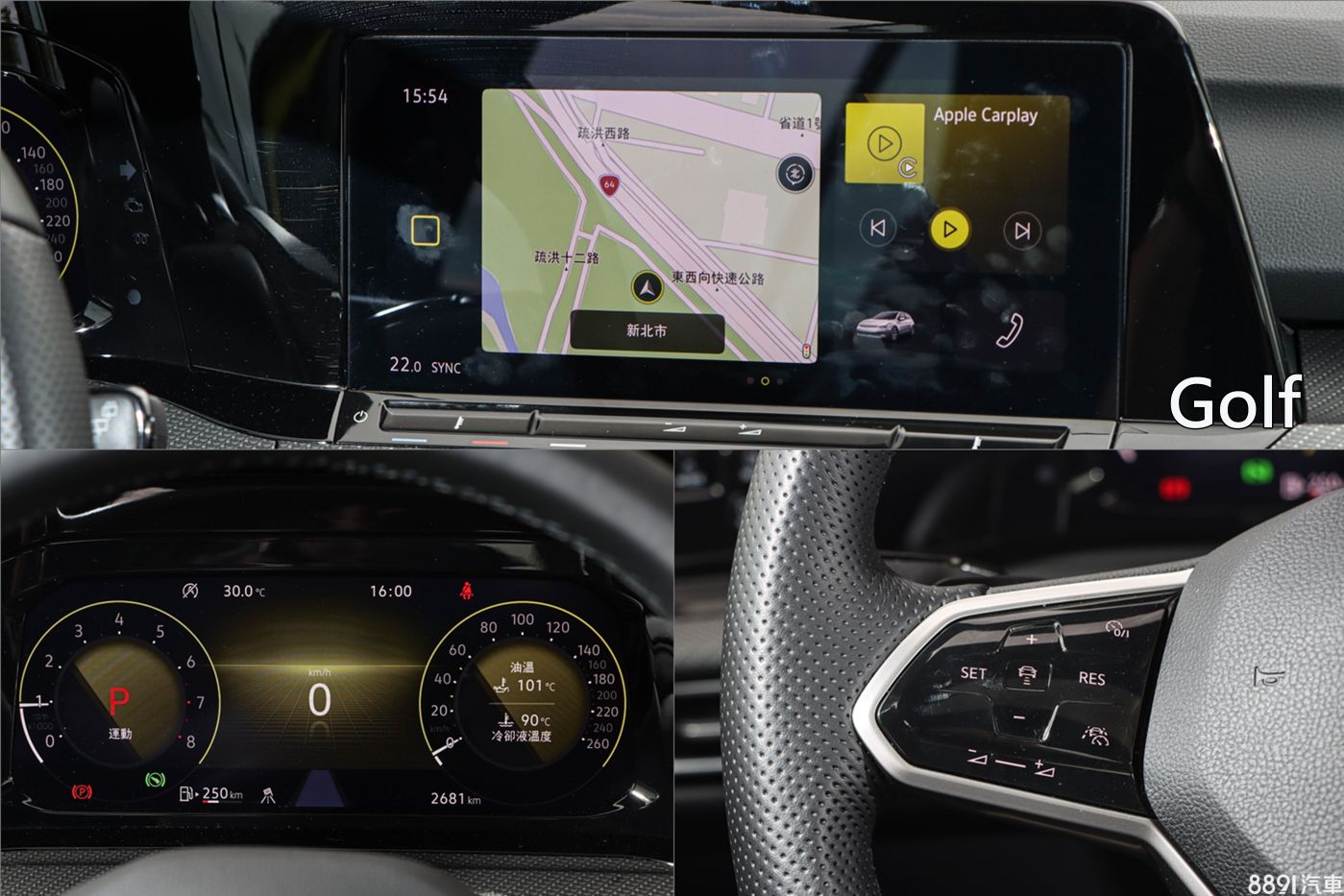 本次兩輛掀背版本都強調動感,但實際感受兩者仍有差異,Golf採用大面積鏡面、霧面飾板材質推疊,多數按鍵皆採用觸控操作,R-Line版本就連方向盤也是觸控,甫以全數位駕駛座艙,在兩者世代差異不大情況下,我們認為Golf科技感更為出色。