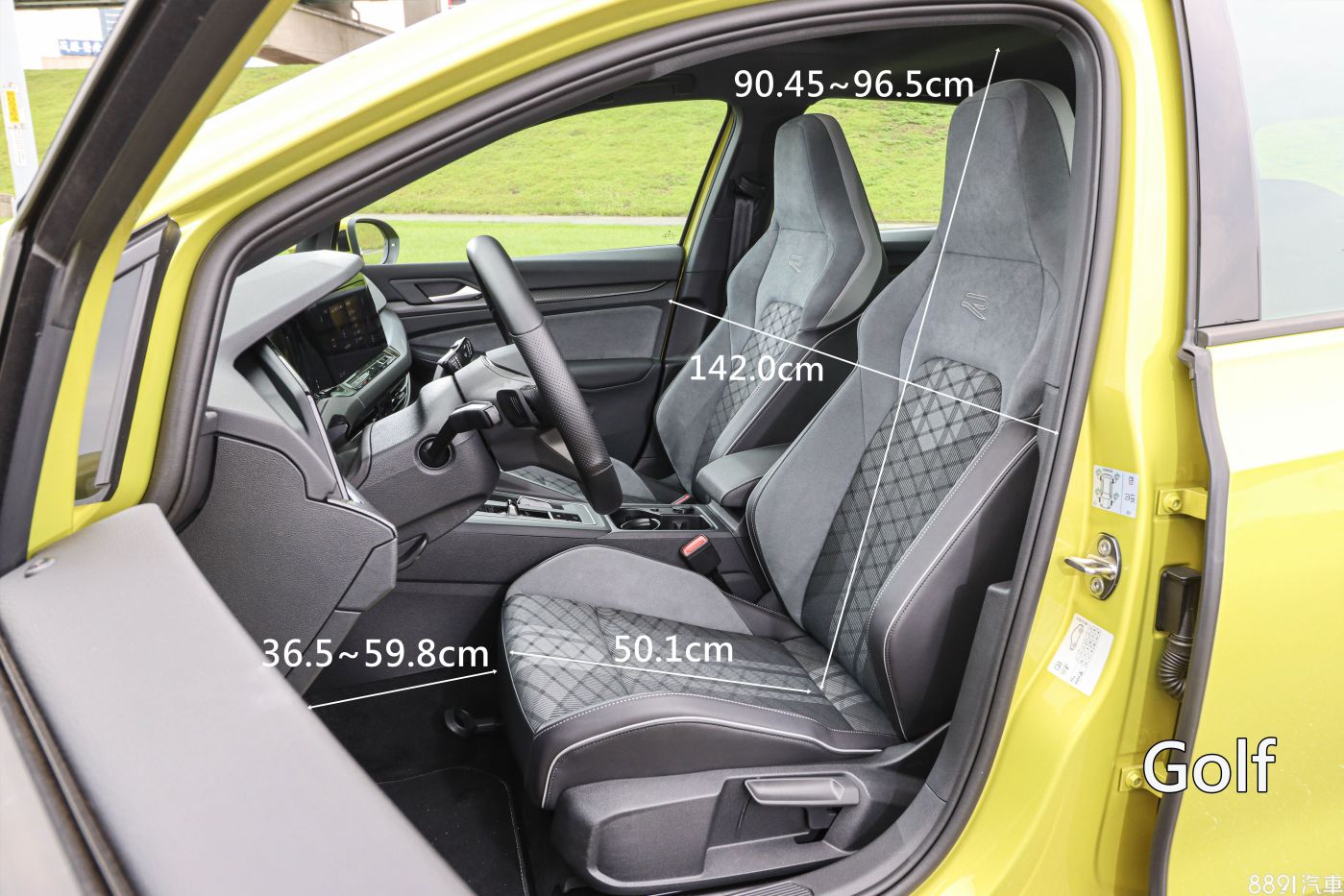 Golf R-Line標配跑車型座椅,泡棉厚度比起Focus ST-Line Lommel更厚實些,造型剪裁立體、兩側包覆性完整,讓人很容易深陷其中,類麂皮材質能有效止滑,觸摸質感也出色,不過由於椅面稍短的關係,大腿支撐性略為遜色,座椅機能僅有雙前座電動腰靠,其餘則需手動調整,便利性稍稍扣分。
