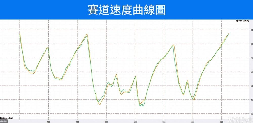 從兩車速度曲線可以清楚看出,兩車過彎速度互有領先,沒有絕對性的勝出,但在出彎加速上,Focus ST-Line Lommel確實沒有展現馬力大32hp的優勢,倒是靠著優異的剎車系統,能在直線底晚一點剎車,最後就在互有優勢、也互有不足的情況下,創下相同的單圈成績。