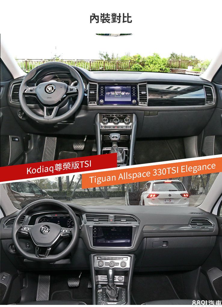 兩者車室與外觀給人的感受相同:「沒有意外」的家族化鋪陳,Kodiaq藉由亮黑烤漆飾板,給人的第一印象較強烈,但「細細品味」之後,由於Tiguan Allspace的壓花處理更能淡化內裝塑料感,質感呈現方面私心認為更勝一籌,頂規版本同樣予以專屬運動化內裝。Tiguan Allspace的科技和便利性配備也比Kodiaq給得更多,不過多標配於高階車款之上。