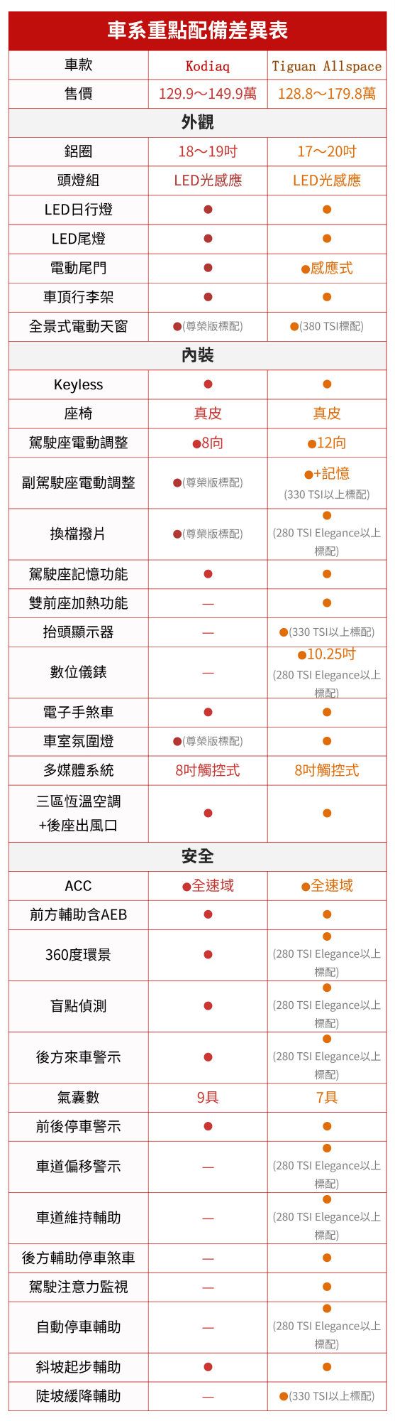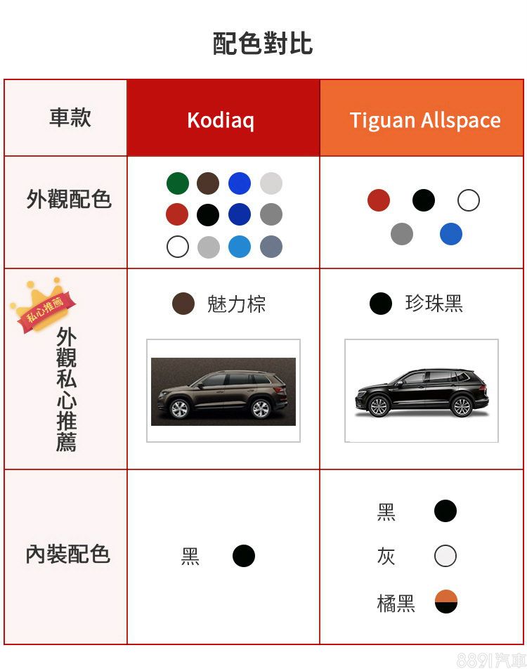 Kodiaq提供多達12種塗裝,其中炫彩紅需加價2.5萬方可獲得,但內裝僅單一黑色設定,相對來說,Tiguan Allspace五種塗裝都是基本款,但內裝則有三種設定可選,這邊推薦的都是符合外觀印象,趨於成熟、穩重的車色。