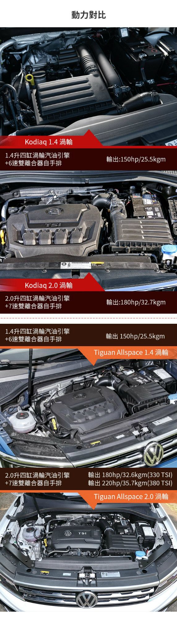 Tiguan Allspace同樣提供1.4升和2.0升四缸渦輪引擎,280 TSI車型輸出150hp/25.5kgm,同樣搭配6速DSG自手排及前驅配置;330 TSI和380 TSI車型,出力分別為180hp/32.6kgm、220hp/35.7kgm,配置的是7速DSG自手排和四驅系統。