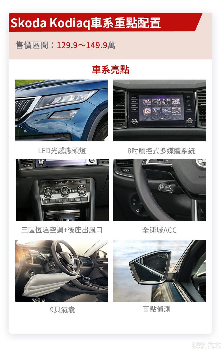 Kodiaq在配備設定上堪稱實際又完善,較特別的是,品牌一向強調的「聰明」設計,使其擁有許多貼心的配置,如中央扶手置杯架便於單手開啟寶特瓶蓋之設計、車門旁的摺傘收納處等,不過整體還是有提升「期望值」的空間,如英文介面的儀錶和多媒體可能對不擅長英文的人有些困擾,還有無車道維持系統,都是小缺憾。此外,數位儀錶、半自動停車輔助需選配,價格分別為3萬、4.1萬元。
