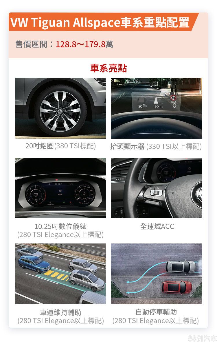 Tiguan Allspace在配備方面說實話真沒啥好挑剔,主被動安全豐富、外觀的「虛華」配備、內裝實用與便利配備該有的都有了,且多數均為要價136.8萬的二階280 TSI Elegance就為標配。
