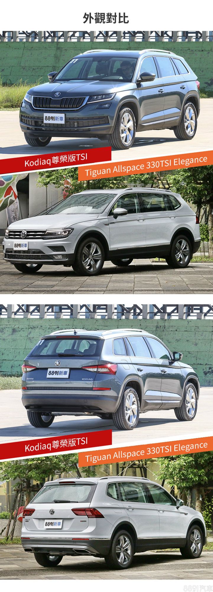 兩台車在外觀特色上都屬中規中矩,恰如其分地演繹家族化設計,沒什麼驚喜,卻也符合此級距一般給人的印象「成熟、穩重」,不過Tiguan Allspace頂規的380 TSI車型擁有R-Line Performance專屬套件,為外觀增添更多具運動氣息的選擇,相形之下Kodiaq車型間差異就沒那麼明顯,配備方面,兩車差異不大,主要是Tiguan Allspace的電動尾門還有感應功能,且鋁圈頂規提供至20吋(Kodiaq為19吋)。