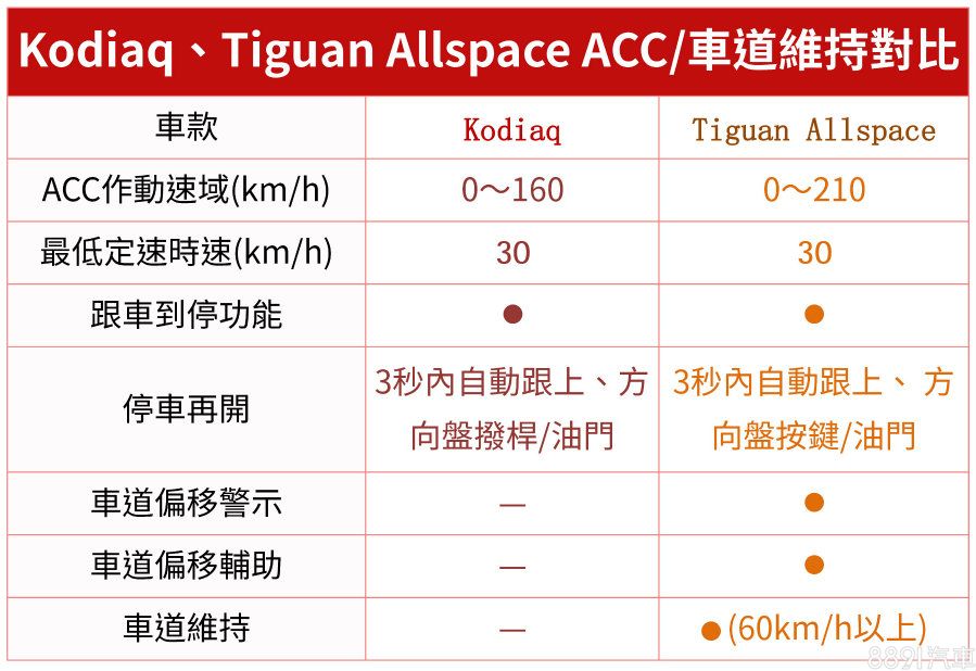 這邊將兩車搭載、也是目前最受到國人關注的ACC等主動安全科技做個對比,兩車ACC都為全速域,且支援跟車到停,差別在於作動速域,Tiguan Allspace更加廣泛,而Kodiaq無車道維持是可惜之處,至於車道偏移警示,可以2.5萬元之代價獲得。