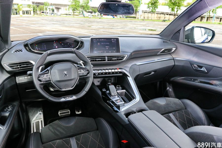 3008中控鋪陳有著強烈的科技氛圍,不僅採數位儀表和中控螢幕,造型特殊的排檔桿和GT車型專屬的雙輻式方向盤搭配駕駛座導向設計,科技與運動感均十分強烈。環繞式的座艙設計強化了視覺上的寬大感,若真要挑剔,大概就是在大螢幕風氣下,或許中央8吋螢幕的規格可再加大一些。