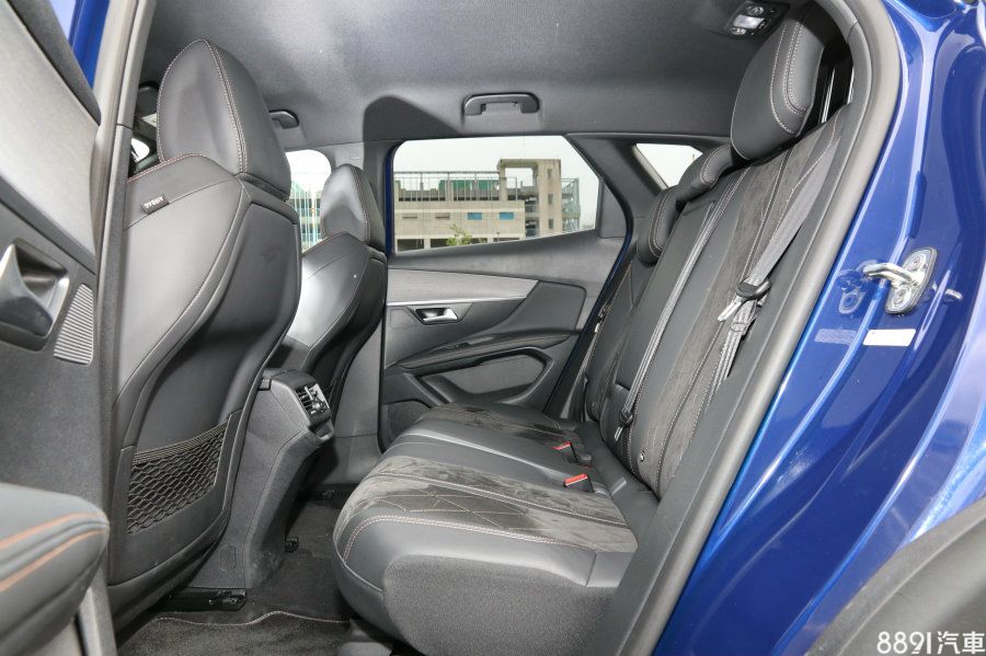 3008 GT採皮革/麂皮混搭座椅,並以菱格紋縫線凸顯質感,原廠尤其宣稱前排座椅採人體工學設計,有助提升乘坐舒適性。相較於對手,3008後排乘坐空間略顯緊促,方正的輪廓保留的頭部空間,但膝部空間及腿部支撐性均略顯不足。