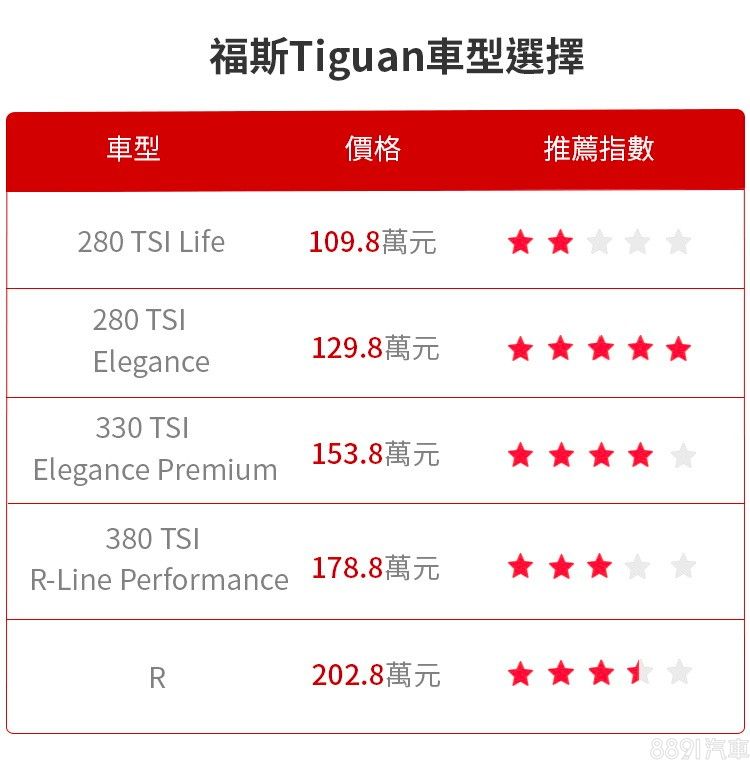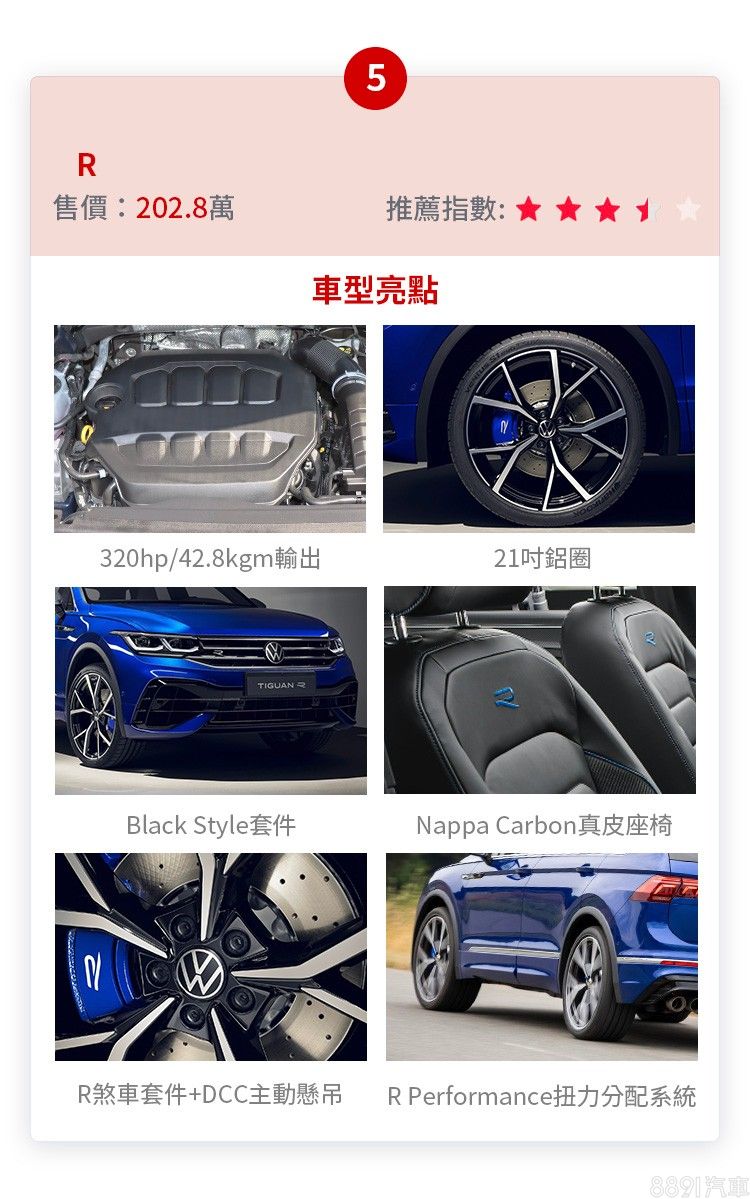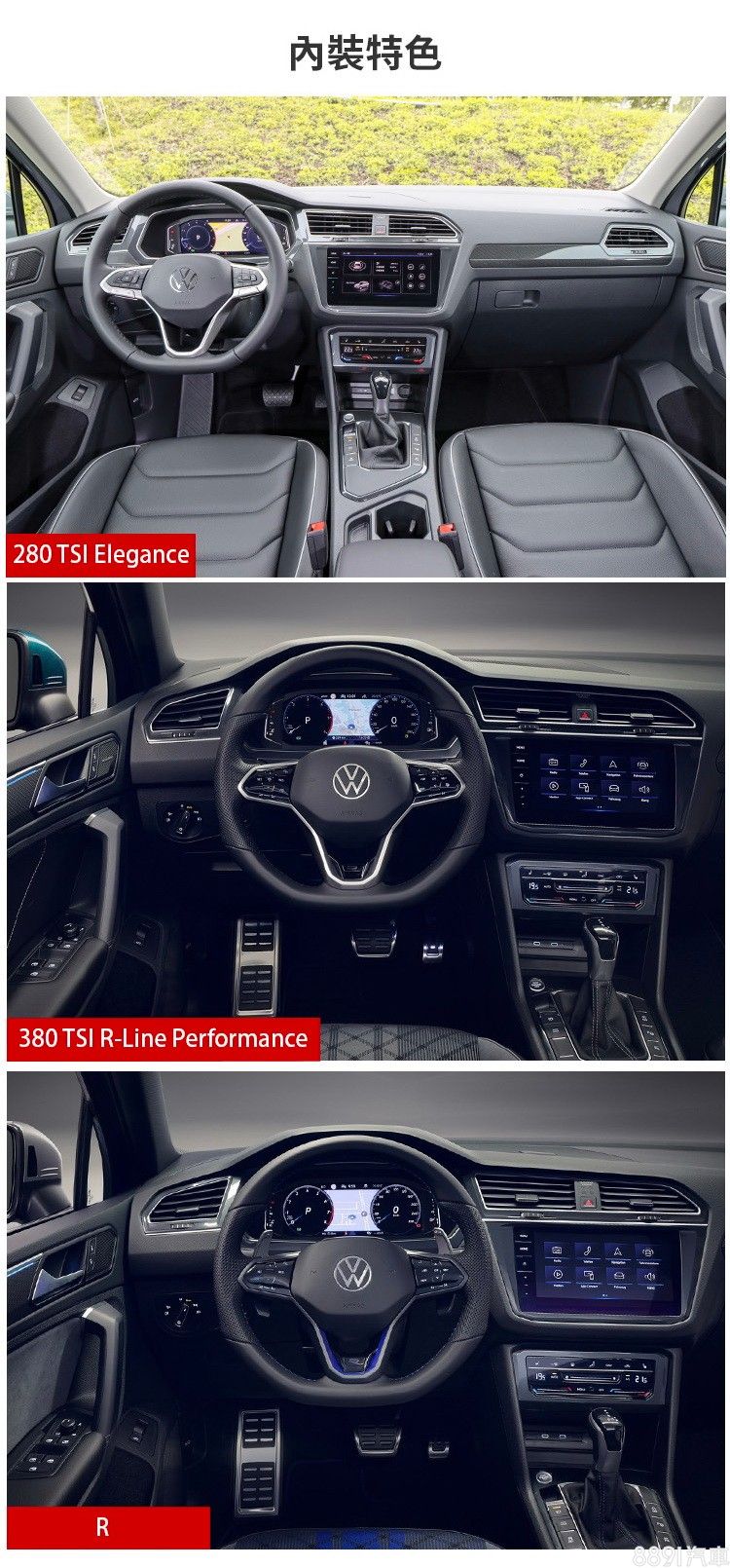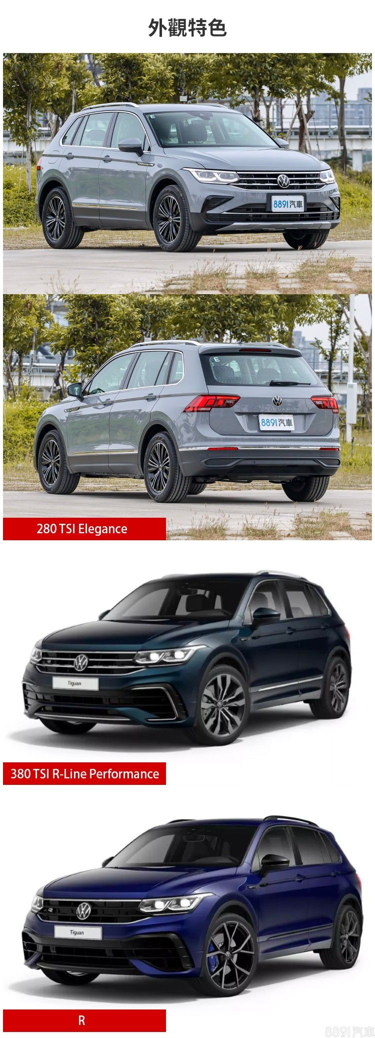 以Tiguan價格帶來看,280 TSI兩款為銷售主力,但入門僅配有ACC主動式車距跟車,其餘像是車道偏移修正/維持、後方橫向車流警示、環景、主動停車皆無配備,要到280 TSI Elegance起才有完整的IQ.DRVIE。向上一階的330 TSI主要差在2.0升動力+4Motion四驅系統,也是Tiguan最便宜的四驅車型;至於R-Line Performance與R兩款車型,主要著墨在性能表現,動力更強、加速更快,開價也與主流中型SUV對手相差甚遠,目標性能玩家族群。