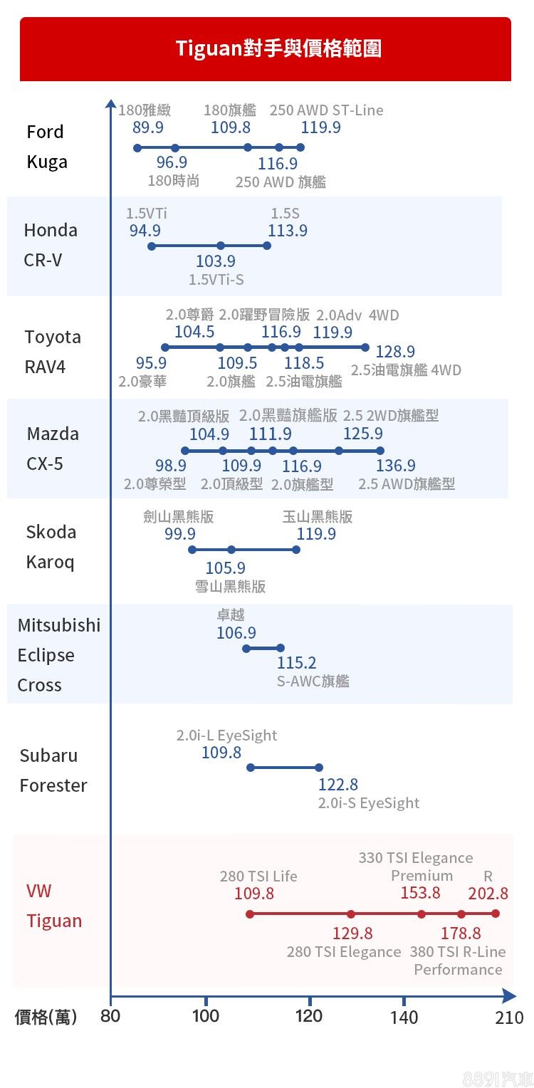 與Tiguan同級的進口對手有RAV4、CX-5、Karoq、Eclipse Cross、Forester等,價格帶坐落在90萬~130萬之間,國產則是Kuga與CR-V,至於Nissan X-Trail、Mitsubishi Outlander、Luxgen URX三款國產休旅主力為百萬內車型,客層並不相同,因此不列入比較。以圖表來看,Tiguan價格帶明顯偏高,買到第二階280 TSI Elegance,要價也差不多是同級頂規了,配備到底夠不夠水準,是為本次導購重點!
