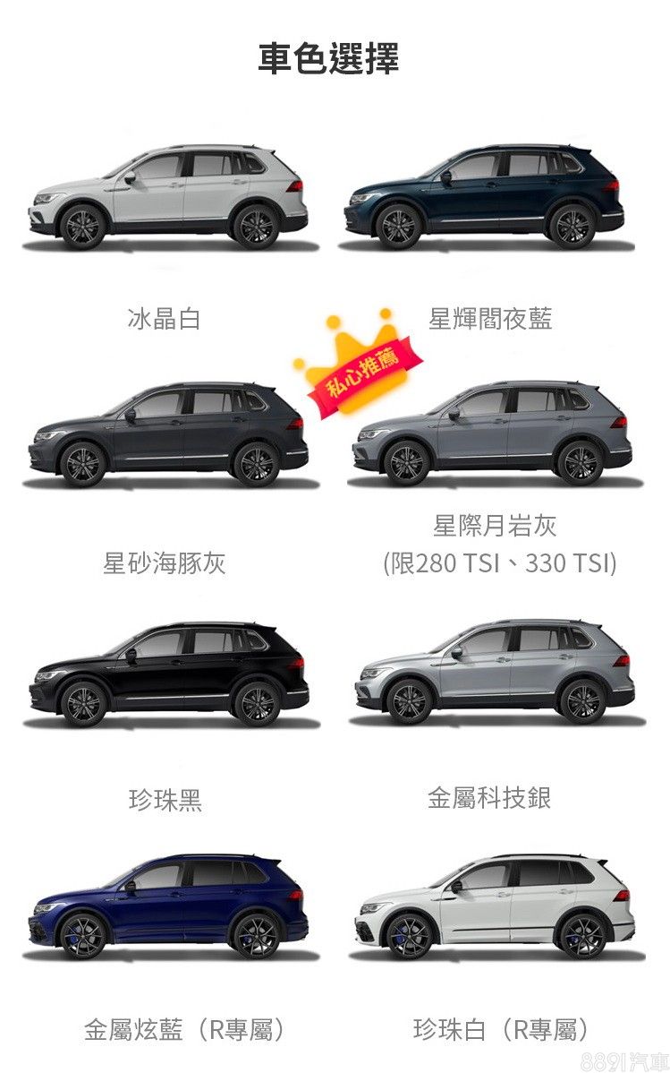 Tiguan車色選擇豐富,除台灣市場最愛的白、黑、銀之外,小改款新增「星輝閰夜藍、星砂海豚灰、星際月岩灰」三種新色,在此推薦星際月岩灰,視覺感近似近年流行的水泥灰,讓穩重的休旅車來點年輕感。