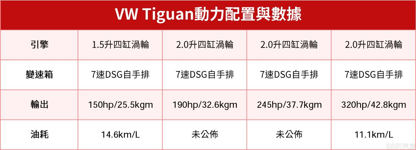 2.0升引擎部分則是動力小幅上漲,330 TSI比改款前多10hp、380 TSI則多出25hp,至於全新導入的Tiguan R擁有320hp/42.8kgm。