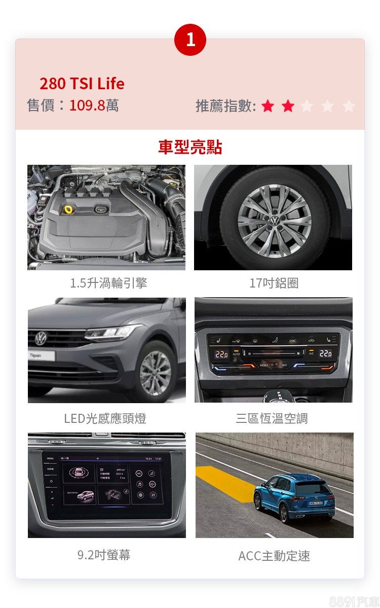 Tiguan入門版開價109.8萬,已經跨入同級對手中間價位帶,以內外配備來說不算陽春,LED頭燈、電動尾門、三區恆溫空調、9.2吋螢幕皆有,但最大的罩門在於只給ACC,沒給車道維持輔助,在高速公路巡航便利度降低,因此成為最不推薦的車型。
