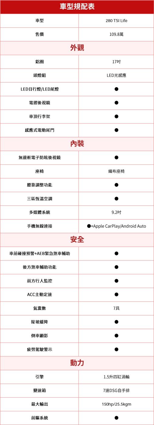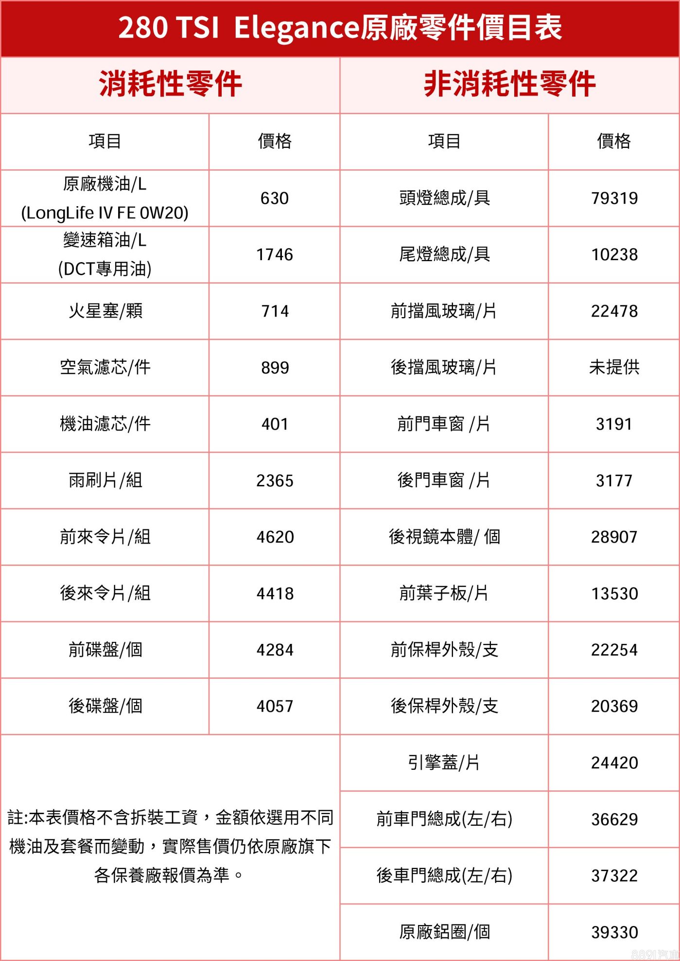 截至出稿前,2.0動力版本仍在預售階段,280 TSI Life則採德訂目前無現車,因此原廠僅提供280 TSI Elegance資料供大家參考。由於福斯原廠改用原廠長效型機油,讓保養週期能拉長至2年或3萬公里保養一次,其餘電汽相關、變速箱、底盤、煞車等則依個人使用狀況彈性檢查,讓買家免於頻頻進廠。
