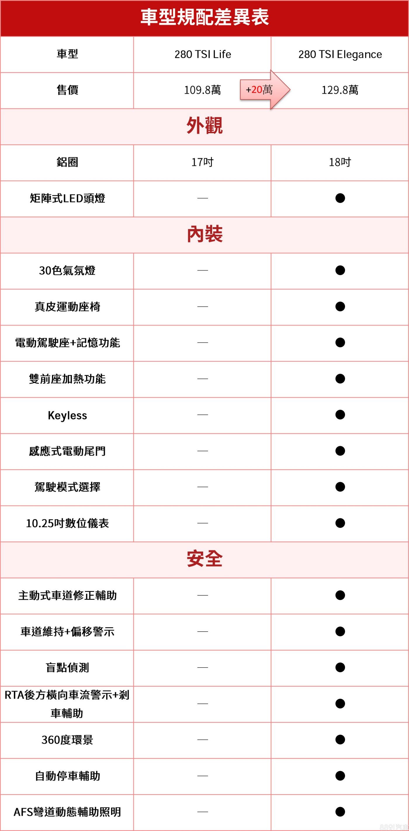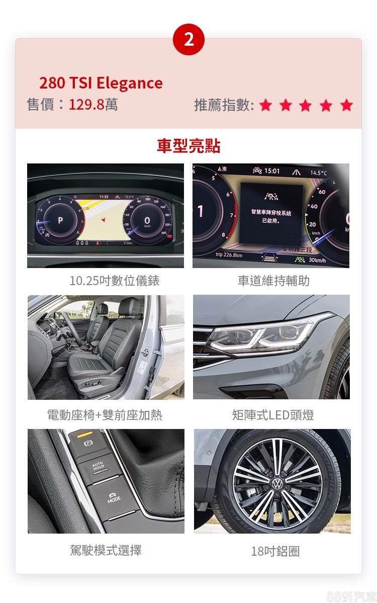 論配備豐富度,買到280 TSI Elegance就很齊全,外觀有矩陣式LED頭燈、18吋雙色鋁圈增加精緻度,內裝還多了電動皮椅、數位儀錶、駕駛模式選擇,對比入門有感升級,更重要的是配備完整的IQ.DRIVE系統,比入門多了車道維持、盲點偵測、RTA後方主動煞停、360環景顯示、主動停車輔助、AFS彎道照明輔助等,Elegance版129.8萬對比同級是高標售價,但確實物有所值,因此最為推薦!
