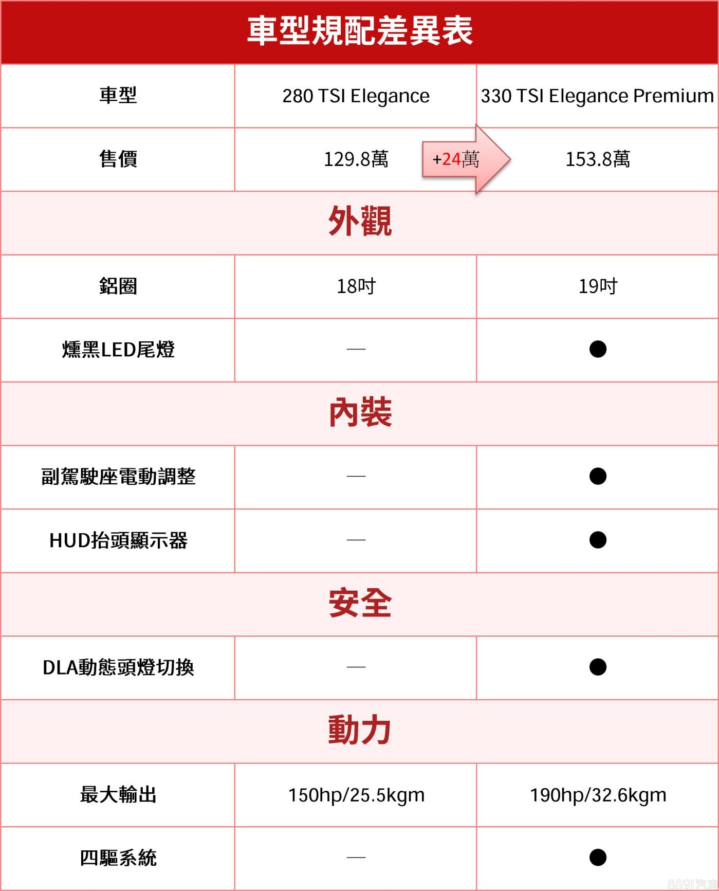 總結下來,買到280 TSI Elegance配備就很齊全,有完整的IQ.DRIVE主動防護、半自動駕駛功能外,像是數位儀錶、電動椅、電動尾門等重點配備也沒少,縱使價格129.8萬不便宜,落在同級高標,但確實物有所值,如果不執著非四驅不可,280 TSI Elegance是普羅休旅買家的最佳選擇。至於性能陣線380 TSI與R價差24萬,攻頂可以享受到更刺激的加速與操控樂趣,且原廠出品的協調性,我相信是事後花25萬改不出來的,買正R才無懸念!