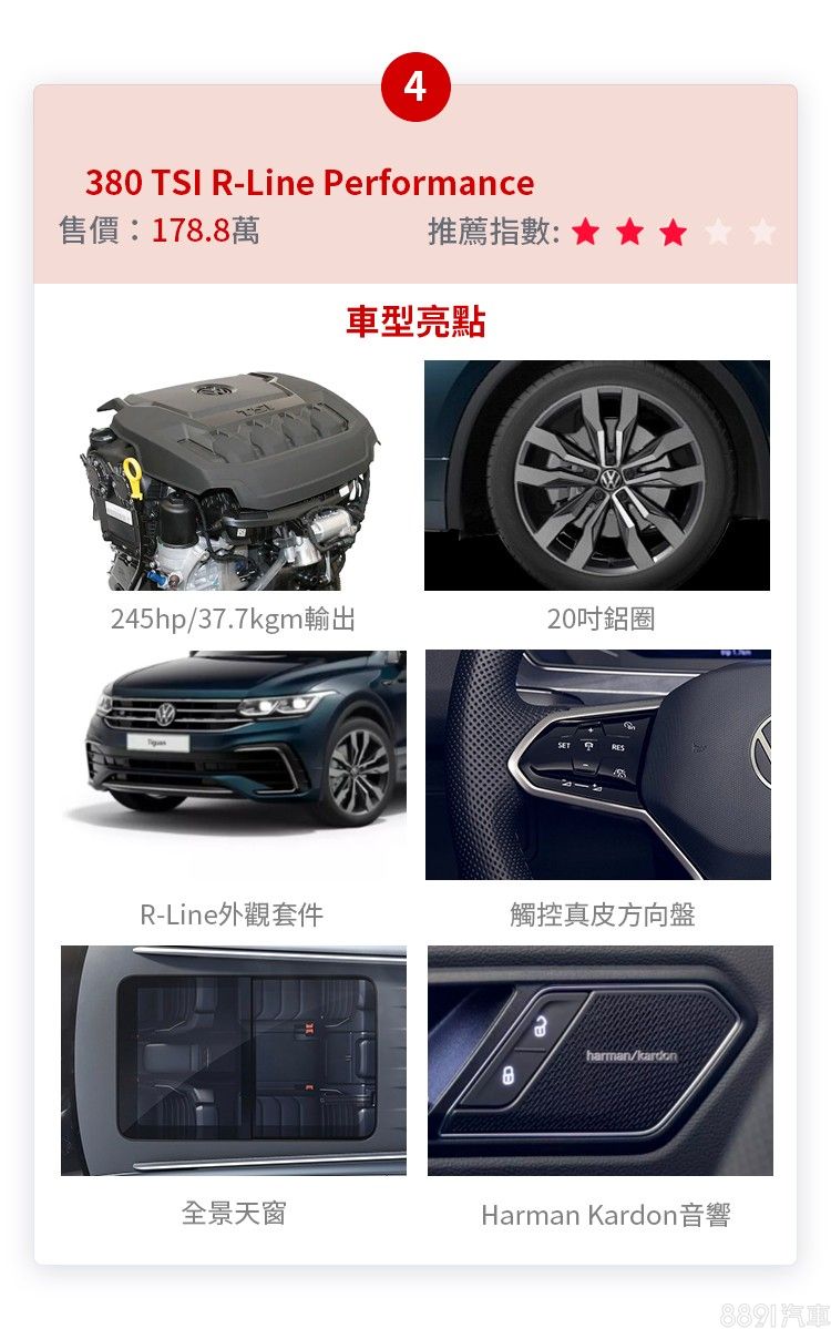如果開車環境得用上四驅,並列入購車必要條件時,330 TSI Elegance Premium便是四驅Tiguan最便宜的選擇,同時2.0升渦輪引擎也帶來更好的190hp動力,這便是比上一階多24萬價值所在。其餘比較有感的就是DLA頭燈主動光型變化、HUD抬頭顯示器,多少也能提升用車便利性。不過考量到一般道路使用環境下,280 TSI動力足敷使用,四驅也非大宗休旅買家的選購重點,因此給出四星推薦。