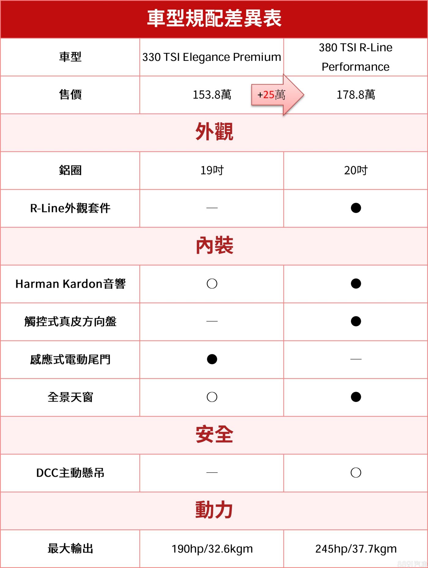 380 TSI R-Line Performance產品定位偏向性能化,動力比330 TSI多了55hp來到245hp,0~100km/h加速為6秒,也有20吋框與運動化外觀套件加持,內裝則多出高階音響、全景天窗、觸控方向盤等配備,豪華感更高,但或許是定價策略考量,拔掉了感應式電動尾門功能,是較可惜的地方。380 TSI與R車型都是瞄準性能買家,但兩者價差達24萬,為何反而更推直上R?主要是性能表現差很大!