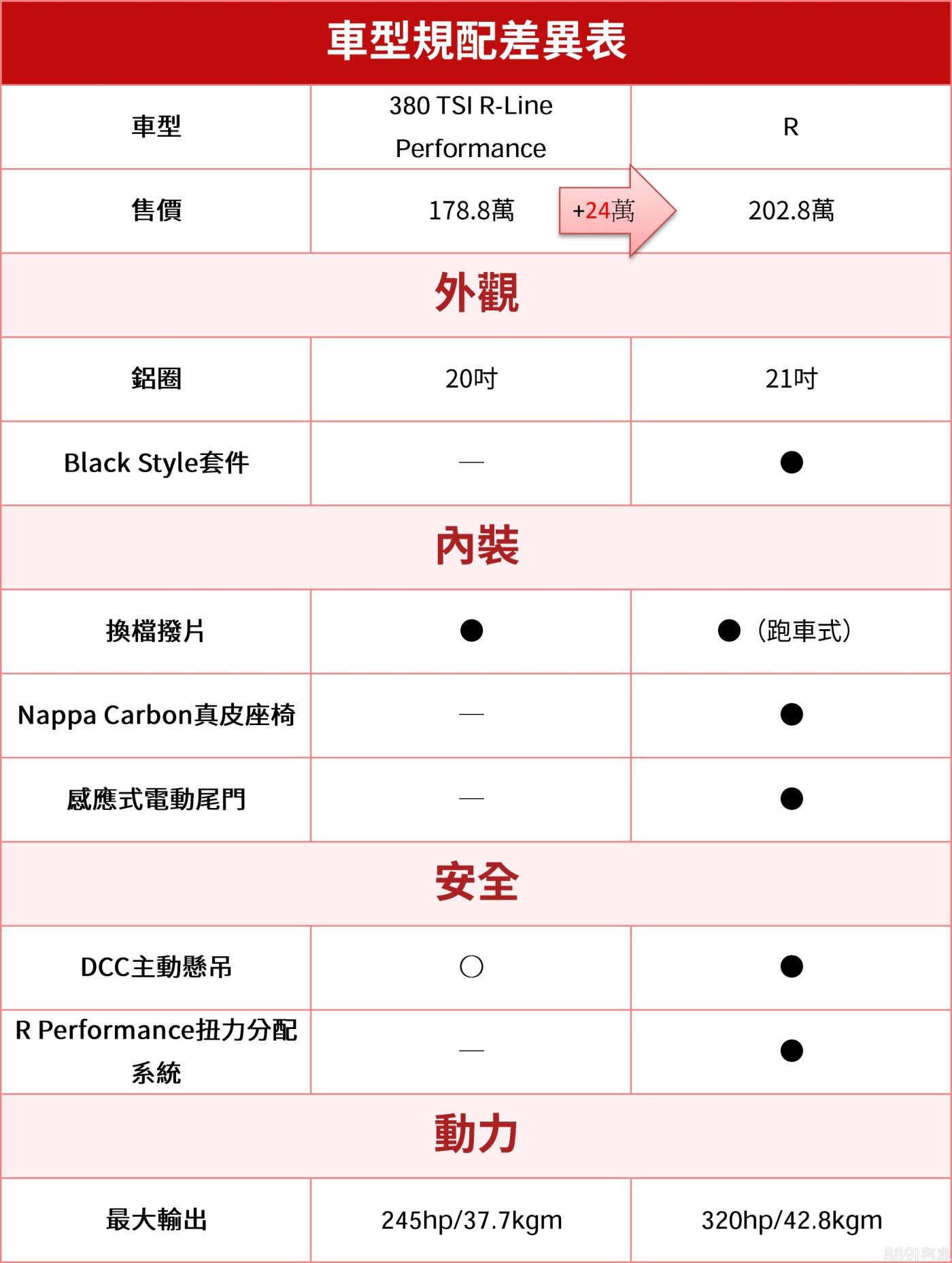 R車型就直接來說性能差距吧,在動力爆增至320hp後,0~100km/h加速表現也從380 TSI的6秒進步至4.5秒,過程中還有更好聽的排氣聲浪加持,除動力差異外,R車型也獨有DCC電子懸吊,R Performance扭力分導系統則能營造更偏向後驅的駕駛感受,如果你真的想玩性能車,加價24萬直上最強的R吧!