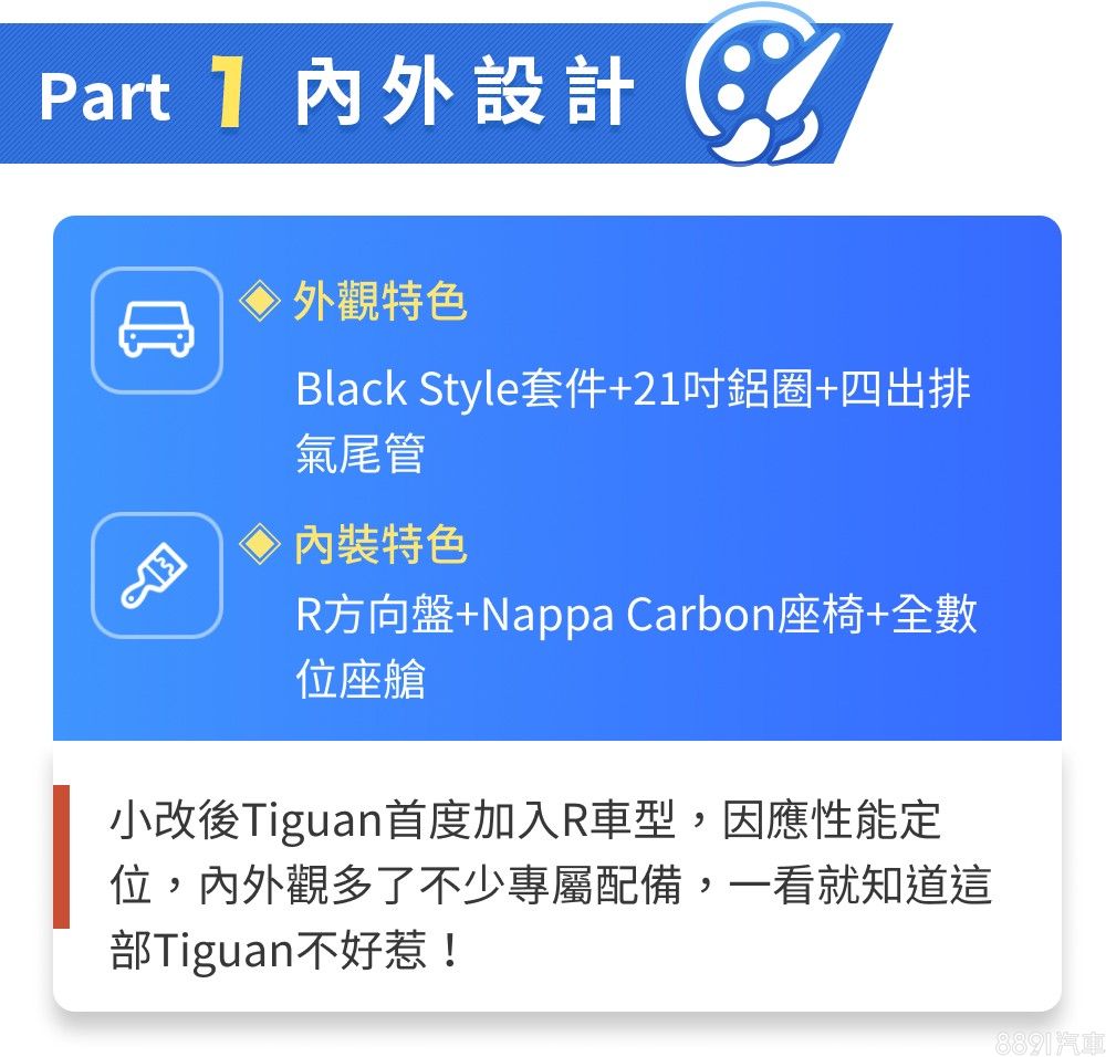 畢竟R是正宗的性能版本,相較於只是運動化的R-Line車型,外觀的兇狠程度高出許多,標配Black Style套件,包含黑化的前後保桿細節、側裙、後視鏡,四周也追加R銘牌,並提供金屬炫藍、珍珠白兩款專屬配色,凸顯高性能R車型的特殊性。