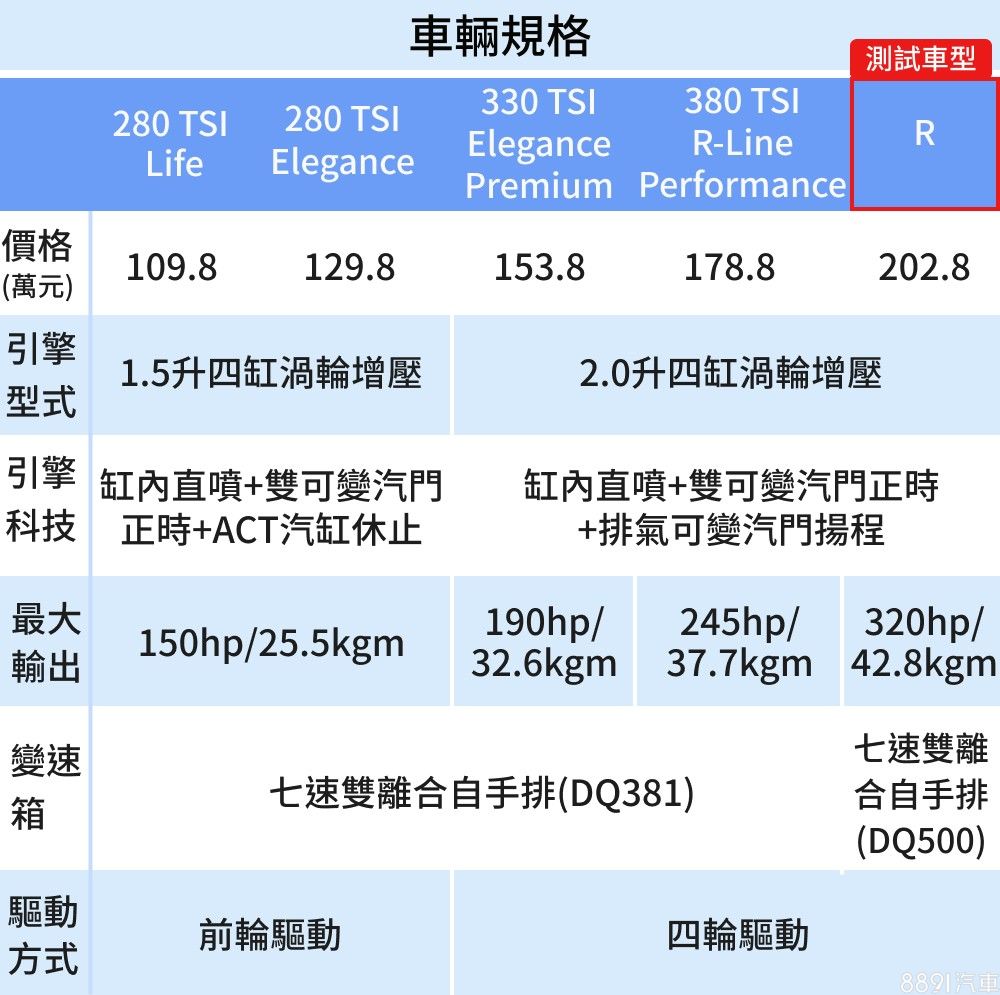 若從Tiguan自身分野來看,280 TSI、330 TSI價格接近台灣主流休旅級距,針對普羅買家而來。往上的380 TSI、R則是瞄準性能買家,銀彈夠的話,R雖然比380 TSI貴了24萬,但馬力增加75hp,變速箱不同,並多了R Performance後軸扭力分導系統,光這幾樣就值回價差,真的想玩性能休旅,買R一次到位吧!